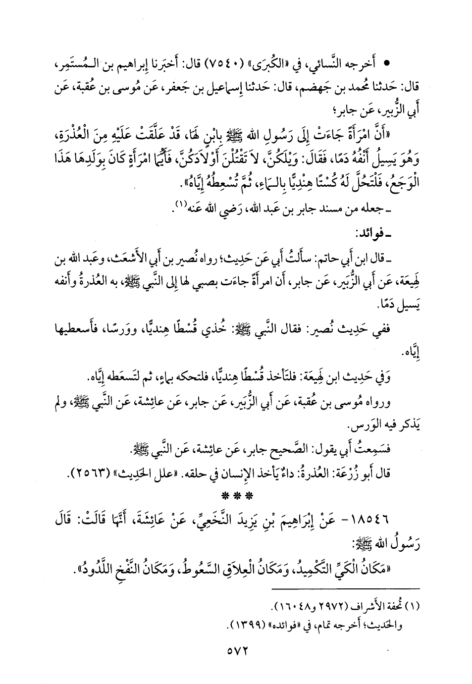 - قلنا إِسناده ضعيفٌ؛ قال ابن أبي حاتم: سألتُ أبي عن حديثٍ؛ رواه نصير بن أبي الأشعث، وعبد الله بن لَهِيعة، عن أبي الزبير، عن جابر، أن امرأة جاءت بصبي لها إلى النبي صَلى الله عَليه وسَلم به العذرة وأنفه يسيل دما.