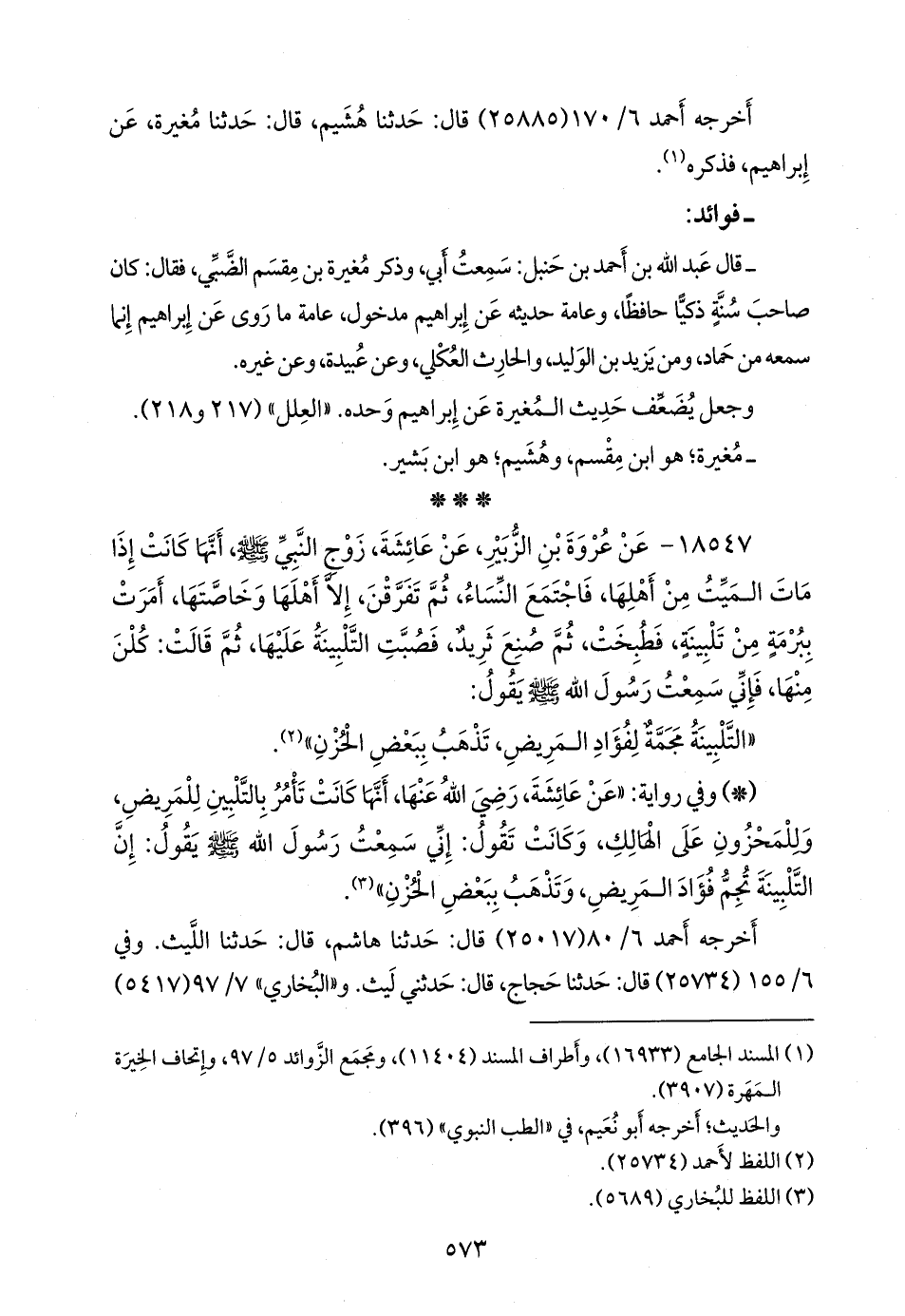 - وفي رواية: «عن عائشة، رضي الله عنها، أنها كانت تامر بالتلبين للمريض، وللمحزون على الهالك، وكانت تقول: إني سمعت رسول الله صَلى الله عَليه وسَلم يقول: إن التلبينة تجم فؤاد المريض، وتذهب ببعض الحزن» (¬٢).