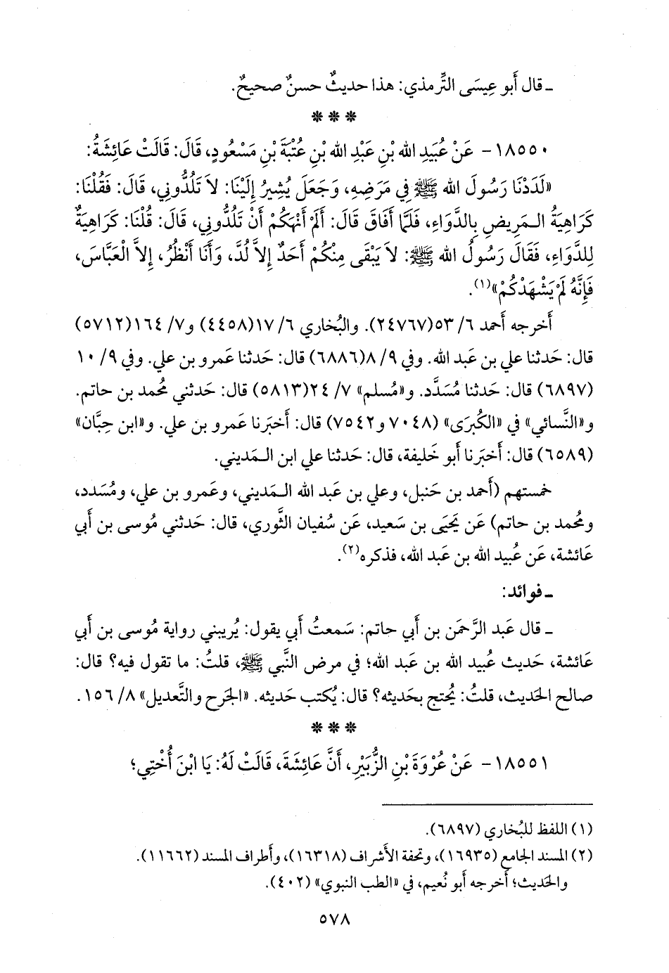خمستهم (أحمد بن حنبل، وعلي بن عبد الله المديني، وعَمرو بن علي الفلَّاس، ومُسَدَّد، ومحمد بن حاتم) عن يحيى بن سعيد، عن سفيان الثوري، قال: حدثني موسى بن أبي عائشة، عن عُبيد الله بن عبد الله، فذكره (¬٢).