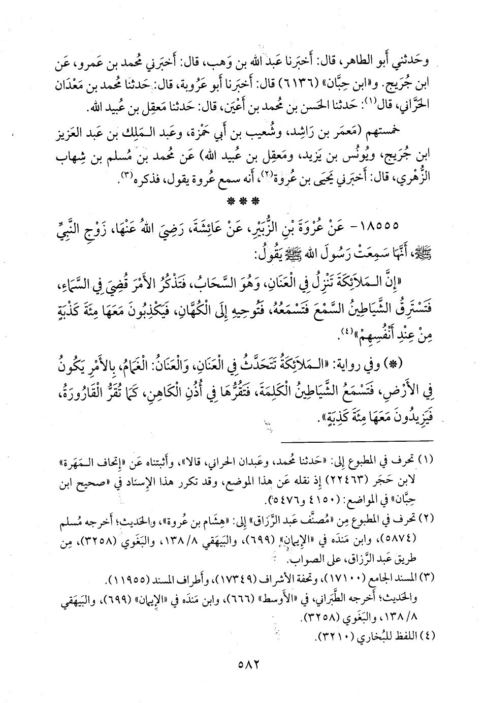 - وفي رواية: «الملائكة تتحدث في العنان، والعنان: الغمام، بالأمر يكون في الأرض، فتسمع الشياطين الكلمة، فتقرها في أذن الكاهن، كما تقر القارورة، فيزيدون معها مئة كِذْبةً».