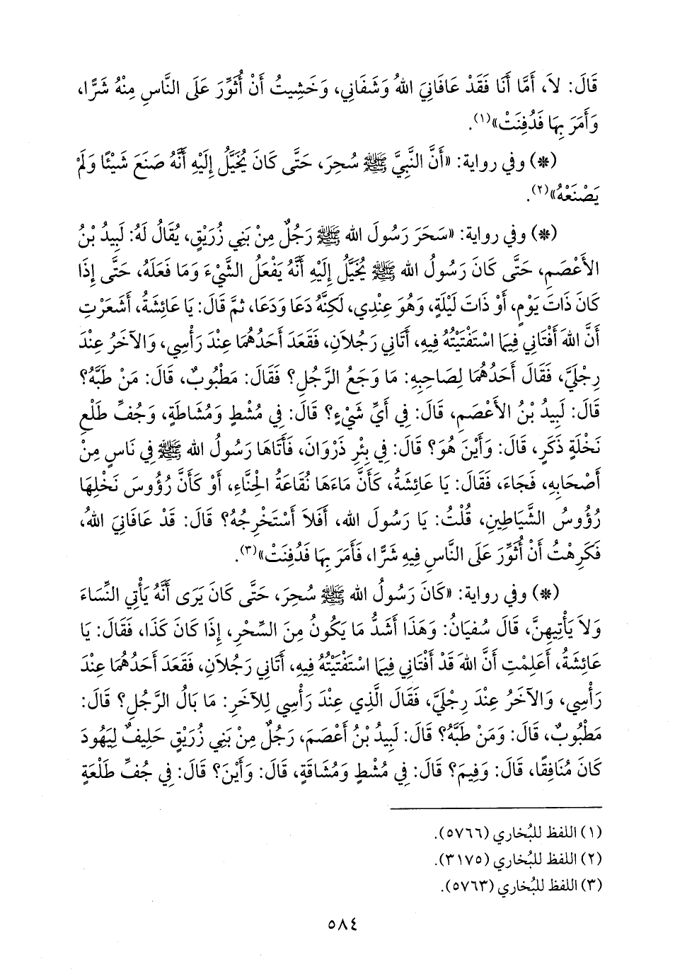 - وفي رواية: «سحر رسول الله صَلى الله عَليه وسَلم رجل من بني زريق، يقال له: لبيد بن الأعصم، حتى كان رسول الله صَلى الله عَليه وسَلم يخيل إليه أنه يفعل الشيء وما فعله، حتى إذا كان ذات يوم، أو ذات ليلة، وهو عندي، لكنه دعا ودعا، ثم قال: يا عائشة، أشعرت أن الله أفتاني فيما استفتيته فيه، أتاني رجلان، فقعد أحدهما عند رأسي، والآخر عند رجلي، فقال أحدهما لصاحبه: ما وجع الرجل؟ فقال: مطبوب، قال: من طبه؟ قال: لبيد بن الأعصم، قال: في أي شيء؟ قال: في مشط ومشاطة، وجف طلع نخلة ذكر، قال: وأين هو؟ قال: في بئر ذروان، فأتاها رسول الله صَلى الله عَليه وسَلم في ناس من أصحابه، فجاء، فقال: يا عائشة، كأن ماءها نقاعة الحناء، أو كأن رؤوس نخلها رؤوس الشياطين، قلت: يا رسول الله، أفلا أستخرجه؟ قال: قد عافاني الله، فكرهت أن أثور على الناس فيه شرا، فأمر بها فدفنت» (¬١).