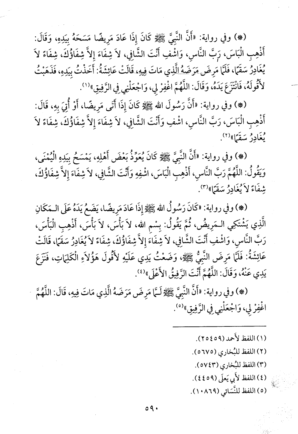- وفي رواية: «كان رسول الله صَلى الله عَليه وسَلم إذا عاد مريضا، يضع يده على المكان الذي يشتكي المريض، ثم يقول: بسم الله، لا باس، لا باس، أذهب الباس، رب الناس، واشف أنت الشافي، لا شفاء إلا شفاؤك، شفاء لا يغادر سقما، قالت عائشة: فلما مرض النبي صَلى الله عَليه وسَلم وضعت يدي عليه لأقول هؤلاء الكلمات، فنزع يدي عنه، وقال: اللهم أنت الرفيق الأعلى» (¬٢).