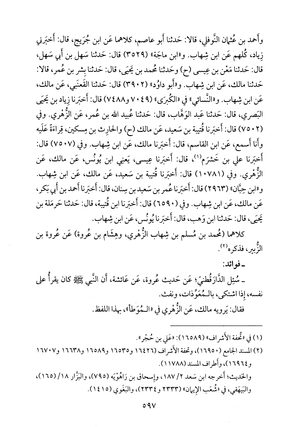 - سئل الدارقُطني؛ عن حديث عروة، عن عائشة، أن النبي صَلى الله عَليه وسَلم كان يقرأ على نفسه، إذا اشتكى، بالمعوذات، ونفث.