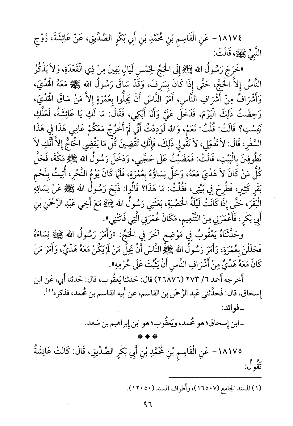 ١٨١٧٤ - عن القاسم بن محمد بن أَبي بكر الصِّدِّيق، عن عائشة، زوج النبي صَلى الله عَليه وسَلم قالت: