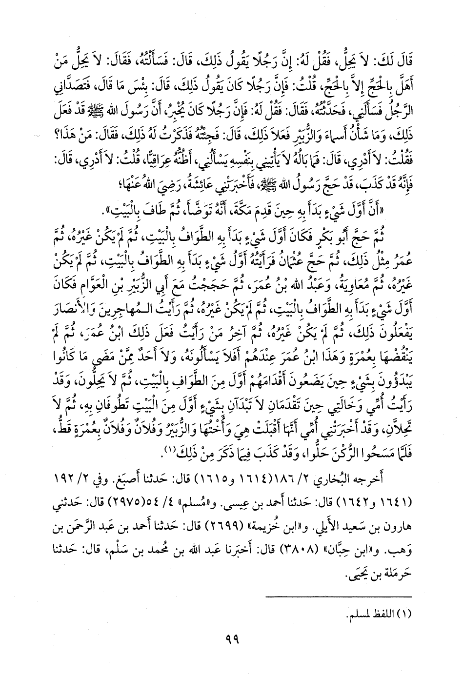 (¬١) ورد في رواية البخاري السابقة: «ثم لم تكن عُمرة»، قال القاضي عياض: «ثم لم يكن غيره»، بالغين المُعجمة، بعدها ياء باثنتين تحتها، ثم ذكر في حج عثمان مثل ذلك، وفي حج الزبير، وذكر البخاري هذا، وقال: «ثم لم تكن عُمرة»، بعين مهملة، بعدها ميم ساكنة، وهو الصواب. «مشارق الأنوار» ٢/ ٨٨.