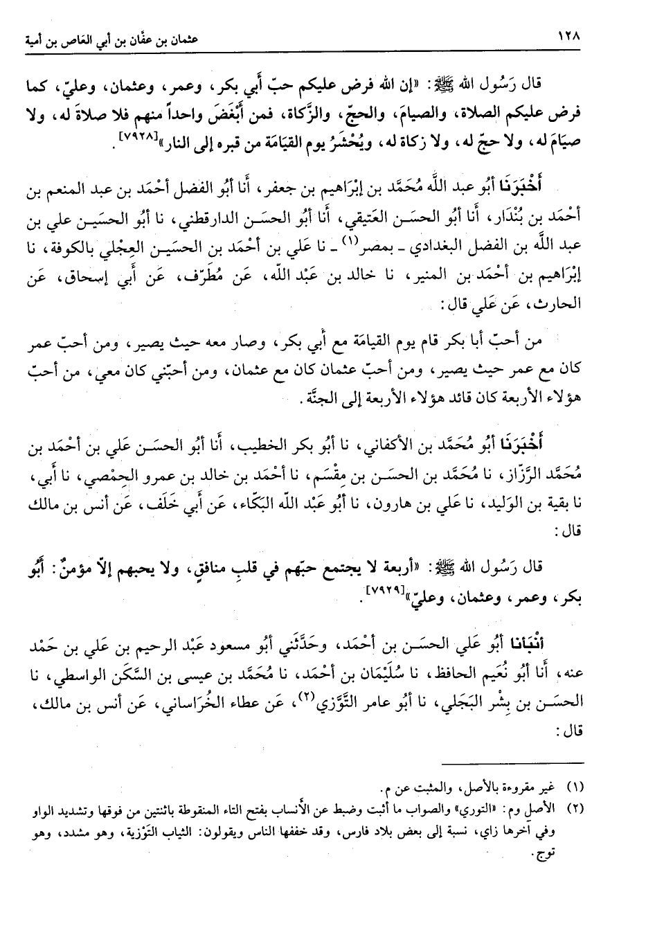 [7928] أخبرنا أبو عبد الله محمد بن إبراهيم بن جعفر أنا أبو الفضل أحمد بن عبد المنعم بن أحمد بن بندار أنا أبو الحسن العتيقي أنا أبو الحسن الدارقطني أنا أبو الحسين علي بن عبد الله بن الفضل البغدادي بمصر (1) أنا علي بن أحمد بن الحسين العجلي بالكوفة أنا إبراهيم بن أحمد بن المنير أنا خالد بن عبد الله عن مطرف عن أبي إسحاق عن الحارث عن علي قال من أحب أبا بكر قام يوم القيامة مع أبي بكر وصار معه حيث يصير ومن أحب عمر كان مع عمر حيث يصير ومن أحب عثمان كان مع عثمان ومن أحبني كان معي من أحب هؤلاء الأربعة كان قائد هؤلاء الأربعة إلى الجنة أخبرنا أبو محمد بن الأكفاني أنا أبو بكر الخطيب أنا أبو الحسن علي بن أحمد بن محمد الرزاز أنا محمد بن الحسن بن مقسم أنا أحمد بن خالد بن عمرو الحمصي أنا أبي نا بقية بن الوليد أنا علي بن هارون أنا أبو عبد الله البكاء عن أبي خلف عن أنس بن مالك قال قال رسول الله (صلى الله عليه وسلم) أربعة لا يجتمع حبهم في قلب منافق ولا يحبهم إلا مؤمن أبو بكر وعمر وعثمان وعلي