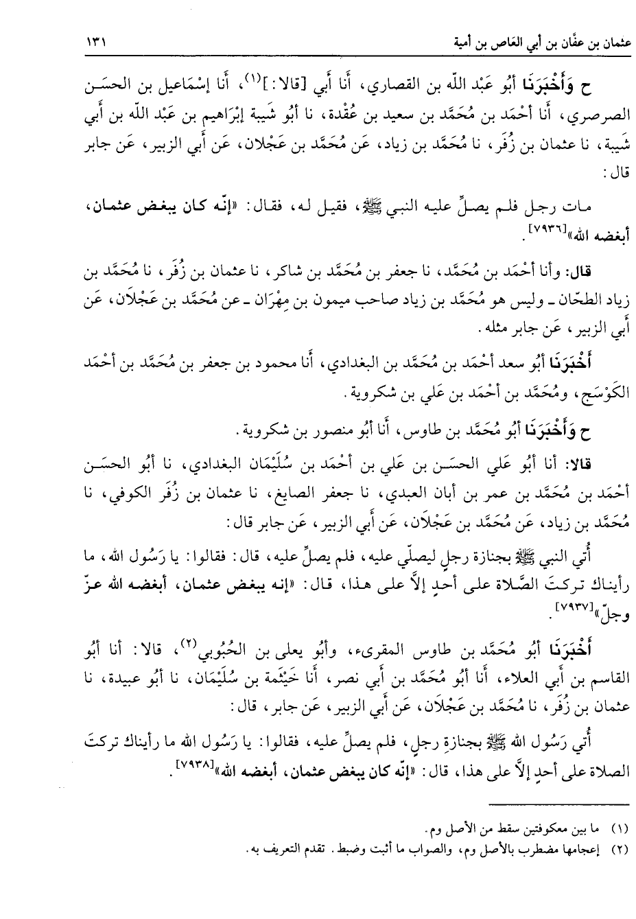 [7937] أخبرنا أبو محمد بن طاوس المقرئ وأبو يعلى بن الحبوبي (2) قالا أنا أبو القاسم بن أبي العلاء أنا أبو محمد بن أبي نصر أنا خيثمة بن سليمان أنا أبو عبيدة أنا عثمان بن زفر أنا محمد بن عجلان عن أبي الزبير عن جابر قال أتي رسول الله (صلى الله عليه وسلم) بجنازة رجل فلم يصل عليه فقالوا يا رسول الله ما رأيناك تركت الصلاة على أحد إلا على هذا قال إنه كان يبغض عثمان أبغضه الله