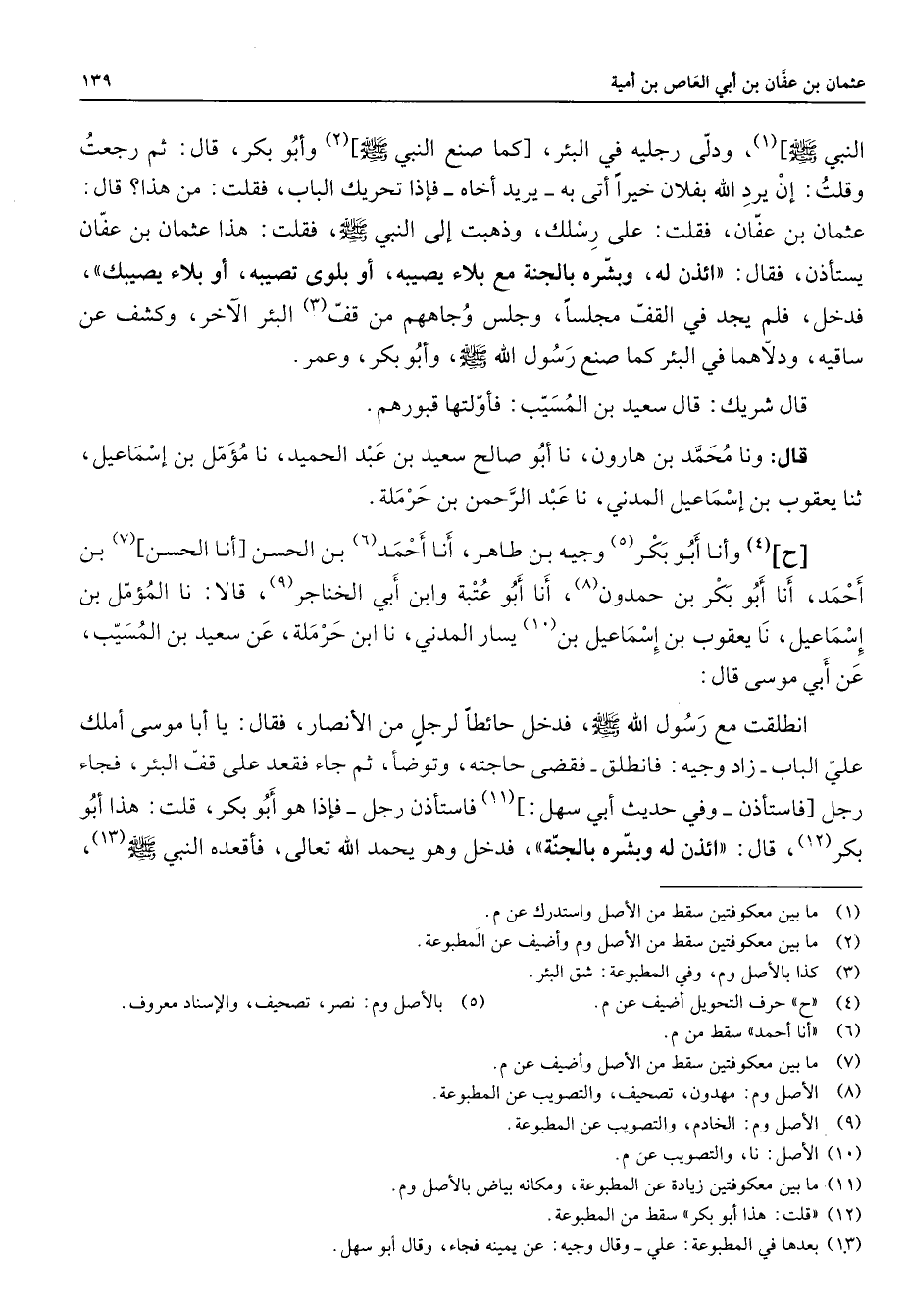 النبي (صلى الله عليه وسلم) (1) ودلى رجليه في البئر كما صنع النبي (صلى الله عليه وسلم) (2) وأبو بكر قال ثم رجعت وقلت إن يرد الله بفلان خيرا أتى به يريد أخاه فإذا تحريك الباب فقلت من هذا قال عثمان بن عفان فقلت على رسلك ذهبت إلى النبي (صلى الله عليه وسلم) فقلت هذا عثمان بن عفان يستأذن فقال ائذن له وبشره بالجنة مع بلاء يصيبه أو بلوى تصيبه أو بلاء يصيبك فدخل فلم يجد في القف مجلسا وجلس وجاههم من قف (3) البئر الآخر وكشف عن ساقيه ودلاهما في البئر كما صنع رسول الله (صلى الله عليه وسلم) وأبو بكر وعمر قال شريك قال سعيد بن المسيب فأولتها قبورهم قال وأنا محمد بن هارون أنا أبو صالح سعيد بن عبد الحميد أنا مؤمل بن إسماعيل ثنا يعقوب بن إسماعيل المدني أنا عبد الرحمن بن حرملة ح (4) وأنا أبو بكر (5) وجيه بن طاهر أنا أحمد (6) بن الحسن أنا الحسن (7) بن أحمد أنا أبو بكر بن حمدون (8) أنا أبو عتبة وابن أبي الخناجر (9) قالا أنا المؤمل بن إسماعيل أنا يعقوب بن إسماعيل (10) بن يسار المدني أنا ابن حرملة عن سعيد بن المسيب عن أبي موسى قال انطلقت مع رسول الله (صلى الله عليه وسلم) فدخل حائطا لرجل من الأنصار فقال يا أبا موسى أملك علي الباب زاد وجيه فانطلق فقضى حاجته وتوضأ ثم جاء فقعد على قف البئر فجاء رجل فاستأذن وفي حديث أبي سهل (11) فاستأذن رجل فإذا هو أبو بكر قلت هذا أبو بكر (12) قال ائذن له وبشره بالجنة فدخل وهو يحمد الله تعالى فأقعده النبي (صلى الله عليه وسلم) (13)