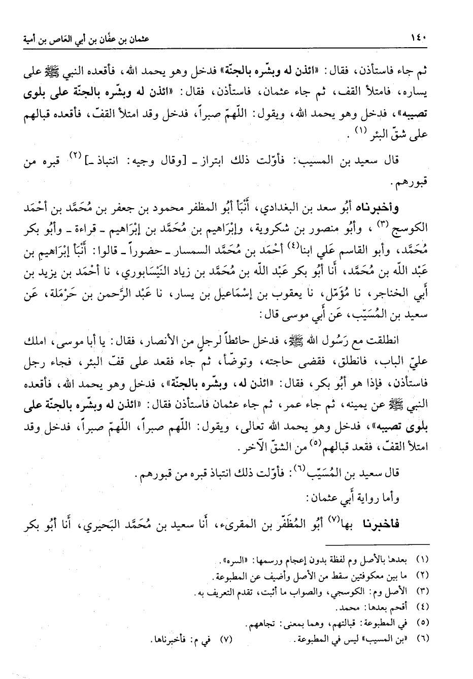 ثم جاء فاستأذن فقال ائذن له وبشره بالجنة فدخل وهو يحمد الله فأقعده النبي (صلى الله عليه وسلم) على يساره فامتلأ القف ثم جاء عثمان فاستأذن فقال ائذن له وبشره بالجنة على بلوى تصيبه فدخل وهو يحمد اللهم ويقول الله صبرا فدخل وقد امتلأ القف فأقعده قبالهم على شق البئر (1) قال سعيد بن المسيب فأولت ذلك ابتراز وقال وجيه انتباذ (2) قبره من قبورهم وأخبرناه أبو سعد بن البغدادي أنبأنا أبو المظفر محمود بن جعفر بن محمد بن أحمد الكوسج (3) وأبو منصور بن شكروية وإبراهيم بن محمد بن إبراهيم قراءة وأبو بكر محمد وأبو القاسم علي ابنا (4) أحمد بن محمد السمسار حضورا قالوا أنبأ إبراهيم بن عبد الله بن محمد أنا أبو بكر عبد الله بن محمد بن زياد النيسابوري أنا أحمد بن يزيد بن أبي الخناجر أنا مؤمل أنا يعقوب بن إسماعيل بن يسار أنا عبد الرحمن بن حرملة عن سعيد بن المسيب عن أبي موسى قال انطلقت مع رسول الله (صلى الله عليه وسلم) فدخل حائطا لرجل من الأنصار فقال يا أبا موسى املك علي الباب فانطلق فقضى حاجته وتوضأ ثم جاء فقعد على قف البئر فجاء رجل فاستأذن فإذا هو أبو بكر فقال ائذن له وبشره بالجنة فدخل وهو يحمد الله فأقعده النبي (صلى الله عليه وسلم) عن يمينه ثم جاء عمر ثم جاء عثمان فاستأذن فقال ائذن له وبشره بالجنة على بلوى تصيبه فدخل وهو يحمد الله تعالى ويقول اللهم صبرا اللهم صبرا فدخل وقد امتلأ القف فقعد قبالهم (5) من الشق الآخر قال سعيد بن المسيب (6) فأولت ذلك ابتباذ قبره من قبورهم وأما رواية أبي عثمان فأخبرنا (7) بها أبو المظفر بن المقرئ أنا سعيد بن محمد البحيري أنا أبو بكر