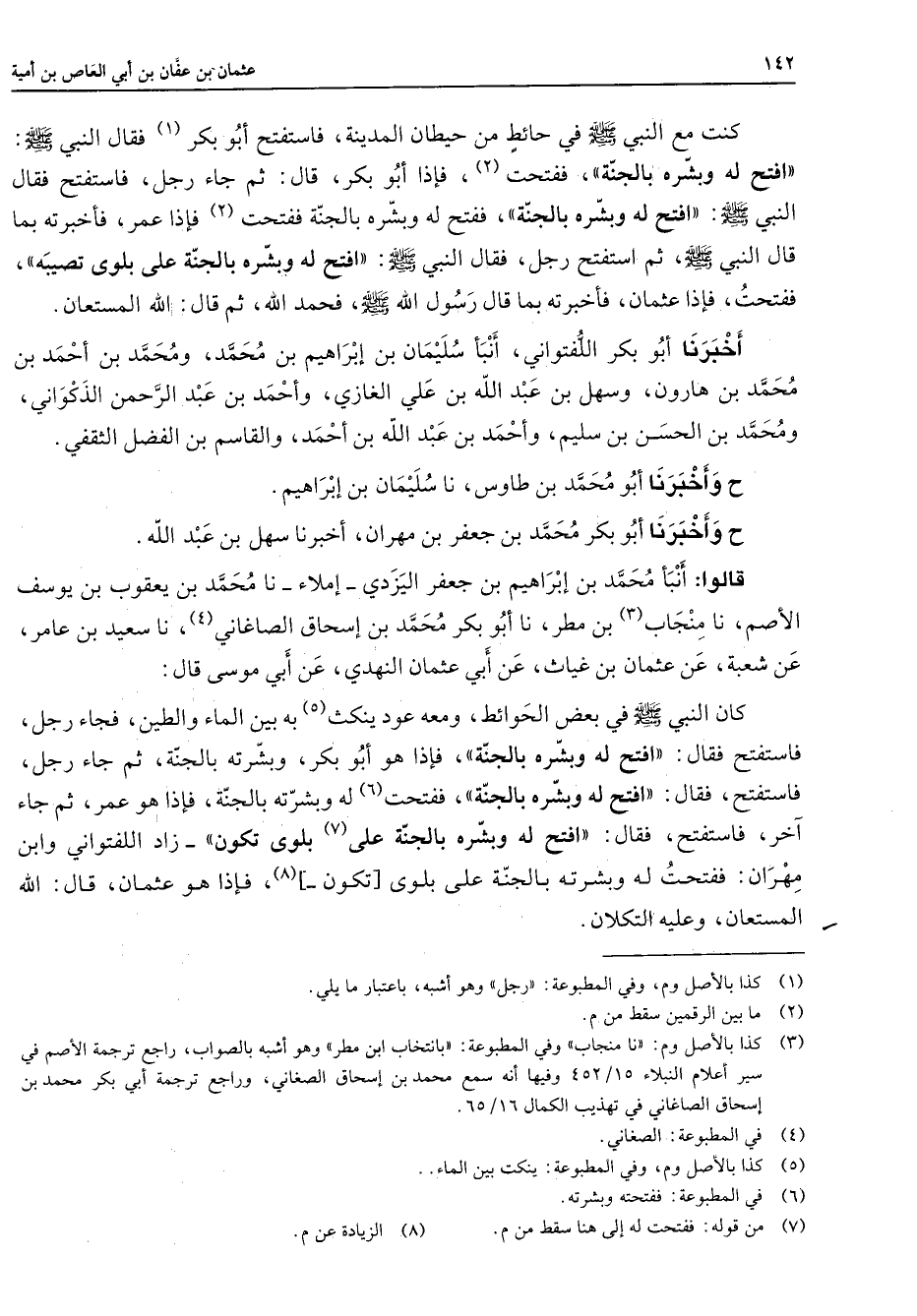 كنت مع النبي (صلى الله عليه وسلم) في حائط من حيطان المدينة فاستفتح أبو بكر (1) فقال النبي (صلى الله عليه وسلم) افتح له وبشره بالجنة ففتحت (2) فإذا أبو بكر قال ثم جاء رجل فاستفتح فقال النبي (صلى الله عليه وسلم) افتح له وبشره بالجنة ففتح له وبشره بالجنة ففتحت (2) فإذا عمر فأخبرته بما قال النبي (صلى الله عليه وسلم) ثم استفتح رجل فقال النبي (صلى الله عليه وسلم) افتح له وبشره بالجنة على بلوى تصيبه ففتحت فإذا عثمان فأخبرته بما قال رسول الله (صلى الله عليه وسلم) فحمد الله ثم قال الله المستعان أخبرنا أبو بكر اللفتواني أنبأ سليمان بن إبراهيم بن محمد ومحمد بن أحمد بن محمد بن هارون وسهل بن عبد الله بن علي الغازي وأحمد بن عبد الرحمن الذكواني ومحمد بن الحسن ب سليم وأحمد بن عبد الله بن أحمد والقاسم بن الفضل الثقفي ح وأخبرنا أبو محمد بن طاوس أنا سليمان بن إبراهيم ح وأخبرنا أبو بكر محمد بن جعفر بن مهران أخبرنا سهل بن عبد الله قالوا أنبأ محمد بن إبراهيم بن جعفر اليزدي إملاء أنا محمد بن يعقوب بن يوسف الأصم أنا منجاب (3) بن مطر أنا أبو بكر محمد بن إسحاق الصاغاني (4) أنا سعيد بن عامر عن شعبة عن عثمان بن غياث عن أبي عثمان النهدي عن أبي موسى قال كان النبي (صلى الله عليه وسلم) في بعض الحوائط ومعه عود ينكث (5) به بين الماء والطين فجاء رجل فاستفتح فقال افتح له وبشره بالجنة فإذا هو أبو بكر وبشرته بالجنة ثم جاء رجل فاستفتح فقال افتح له وبشره بالجنة ففتحت (6) له وبشرته بالجنة فإذا هو عمر ثم جاء آخر فاستفتح فقال افتح له وبشره بالجنة على (7) بلوى تكون زاد اللفتواني وابن مهران ففتحت له وبشرته بالجنة على بلوى تكون (8) فإذا هو عثمان قال الله المستعان وعليه التكلان