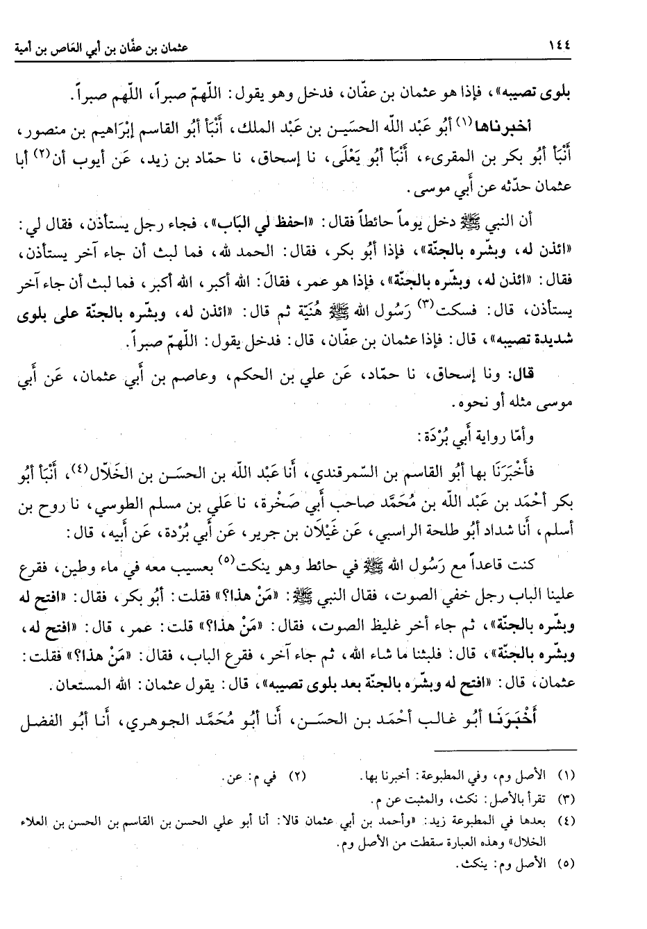 بلوى تصيبه فإذا هو عثمان بن عفان فدخل وهو يقول اللهم صبرا اللهم صبرا أخبرناها (1) أبو عبد الله الحسين بن عبد الملك أنبأ أبو القاسم إبراهيم بن منصور أنبأ أبو بكر بن المقرئ أنبأ أبو يعلى أنا إسحاق أنا حماد بن زيد عن أيوب أن (2) أبا عثمان حدثه عن أبي موسى أن النبي (صلى الله عليه وسلم) دخل يوما حائطا فقال احفظ لي الباب فجاء رجل يستأذن فقال لي ائذن له وبشره بالجنة فإذا أبو بكر فقال الحمدلله فما لبث أن جاء آخر يستأذن فقال ائذن له وبشره بالجنة فإذا هو عمر فقال الله أكبر الله أكبر فما لبث أن جاء آخر يستأذن قال فسكت (3) رسول الله (صلى الله عليه وسلم) هنية ثم قال ائذن له وبشره بالجنة على بلوى شديدة تصيبه قال فإذا عثمان بن عفان قال فدخل يقول اللهم صبرا قال وأنا إسحاق أنا حماد عن علي بن الحكم وعاصم بن أبي عثمان عن أبي موسى مثله أو نحوه وأما رواية أبي بردة فأخبرنا بها أبو القاسم بن السمرقندي أنا عبد الله بن الحسين بن الخلال (4) أنبأ أبو بكر أحمد بن عبد الله بن محمد صاحب أبي صخرة أنا علي بن مسلم الطوسي أنا روح بن أسلم أنا شداد أبو طلحة الراسبي عن غيلان بن جرير عن أبي بردة عن أبيه قال كنت قاعدا مع رسول الله (صلى الله عليه وسلم) في حائط وهو ينكت (5) بعسيب معه في ماء وطين فقرع علينا الباب رجل خفي الصوت فقال النبي (صلى الله عليه وسلم) من هذا فقلت أبو بكر فقال افتح له وبشره بالجنة ثم جاء آخر غليظ الصوت فقال من هذا قلت عمر قال افتح له وبشره بالجنة قال فلبثنا ما شاء الله ثم جاء آخر فقرع الباب فقال من هذا فقلت عثمان قال افتح له وبشره بالجنة بعد بلوى تصيبه قال يقول عثمان الله المستعان أخبرنا أبو غالب أحمد بن الحسن أنا أبو محمد الجوهري أنا أبو الفضل