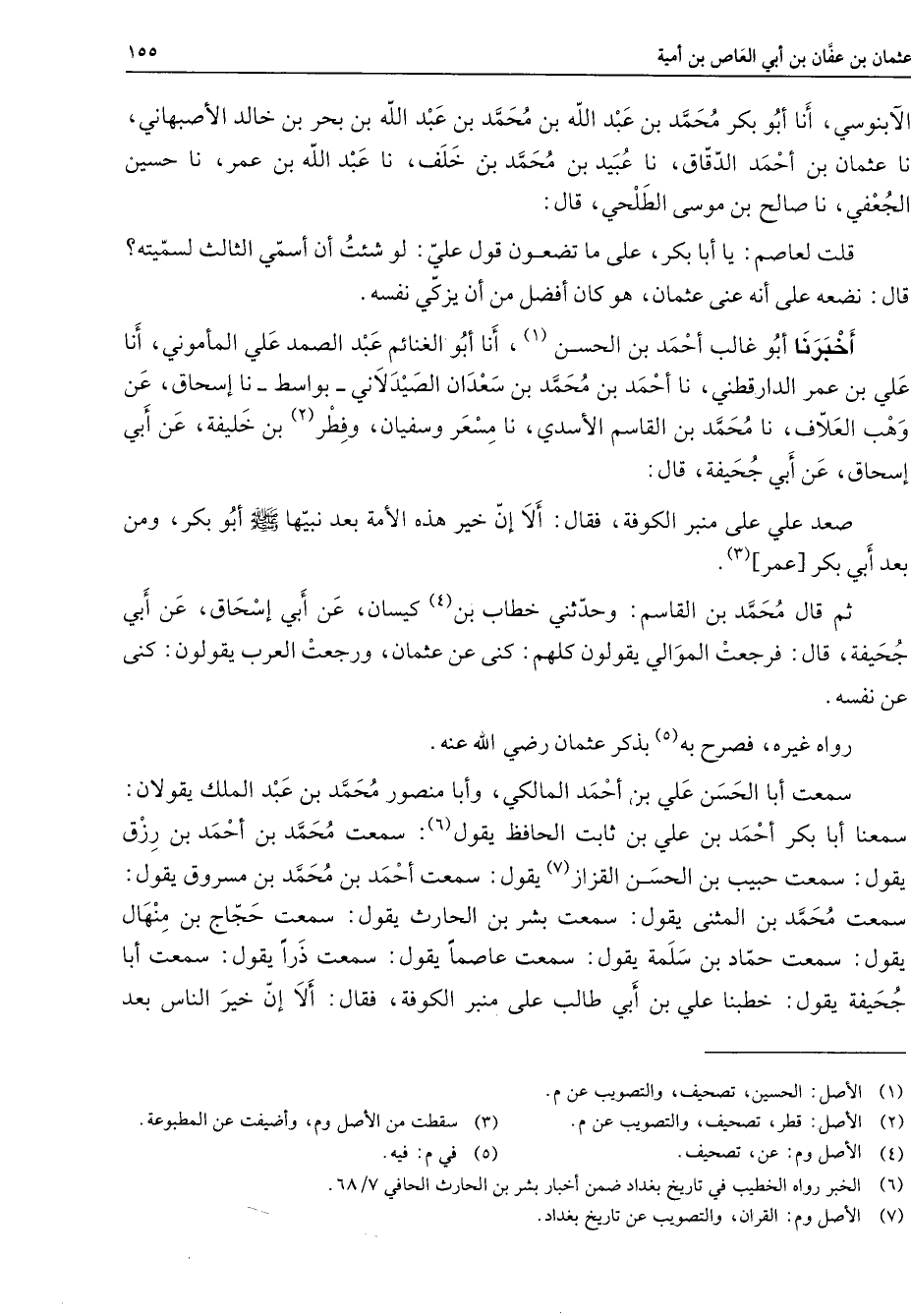 الآبنوسي أنا أبو بكر محمد بن عبد الله بن محمد بن عبد الله بن بحر بن خالد الأصبهاني نا عثمان بن أحمد الدقاق أنا عبيد بن محمد بن خلف أنا عبد الله بن عمر أنا حسين الجعفي أنا صالح بن موسى الطلحي قال قلت لعاصم يا أبا بكر على ما تضعون قول علي لو شئت أن أسمي الثالث لسميته قال نضعه على أنه عنى عثمان هو كان أفضل من أن يزكي نفسه أخبرنا أبو غالب أحمد بن الحسن (1) أنا أبو الغنائم عبد الصمد علي المأموني أنا علي بن عمر الدارقطني أنا أحمد بن محمد بن سعدان الصيدلاني بواسط أنا إسحاق عن وهب العلاف أنا محمد بن القاسم الأسدي أنا مسعر وسفيان وفطر (2) بن خليفة عن أبي إسحاق عن أبي جحيفة قال صعد علي على من منبر الكوفة فقال ألا إن خير هذه الأمة بعد نبيها (صلى الله عليه وسلم) أبو بكر ومن بعد أبي بكر عمر (3) ثم قال محمد بن القاسم وحدثني خطاب بن (4) كيسان عن أبي إسحاق عن أبي جحيفة قال فرجعت الموالي يقولون كلهم كنى عن عثمان ورجعت العرب يقولون كنى عن نفسه رواه غيره فصرح به (5) بذكر عثمان Bهـ سمعت أبا الحسن علي بن أحمد المالكي وأبا منصور محمد بن عبد الملك يقولان سمعنا أبا بكر أحمد بن علي بن ثابت الحافظ يقول (6) سمعت محمد بن أحمد بن رزق يقول سمعت حبيب بن الحسن القزاز (7) يقول سمعت أحمد بن محمد بن مسروق يقول سمعت محمد بن المثنى يقول سمعت بشر بن الحارث يقول سمعت حجاج بن منهال يقول سمعت حماد بن سلمة يقول سمعت عاصما يقول سمعت ذرا يقول سمعت أبا جحيفة يقول خطبنا علي بن أبي طالب على منبر الكوفة فقال ألا إن خير الناس بعد