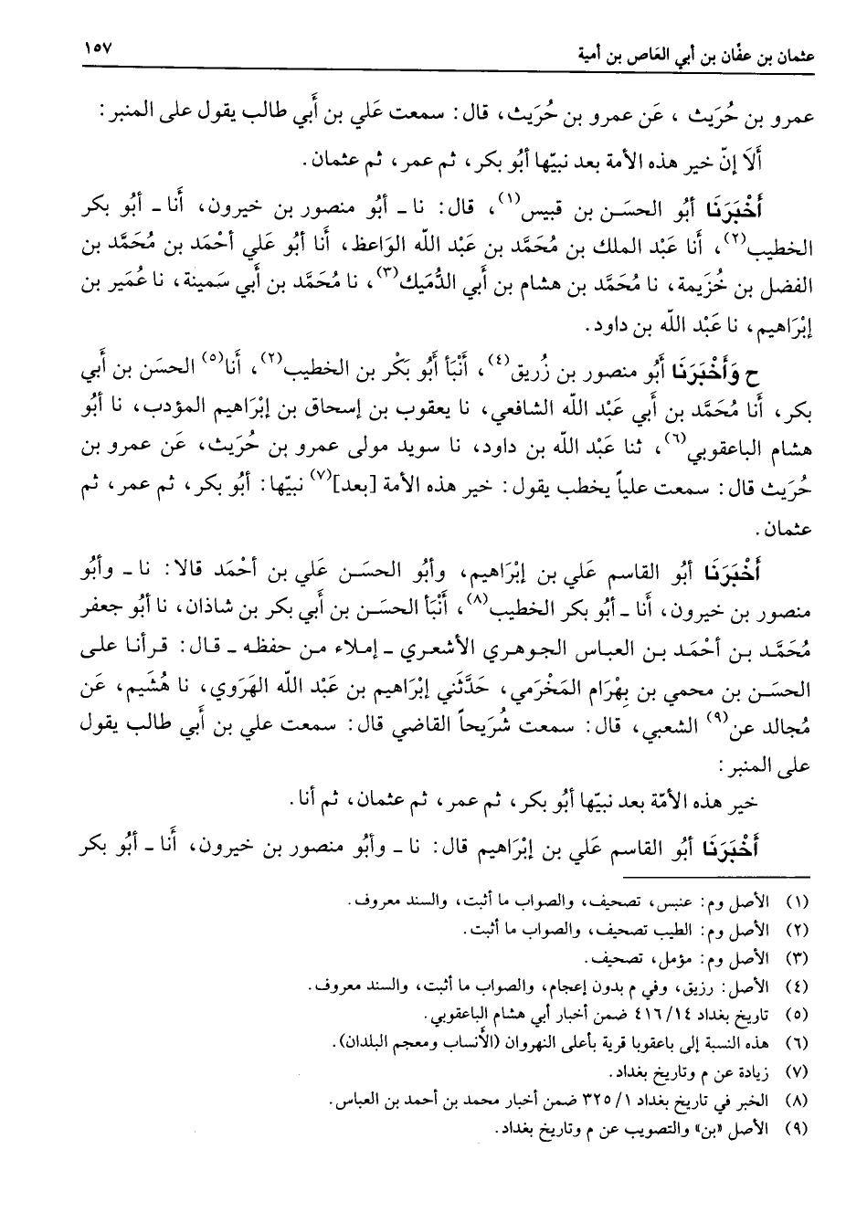 عمرو بن حريث عن عمرو بن حريث قال سمعت علي بن أبي طالب يقول على المنبر ألا إن خير هذه الأمة بعد نبيها أبو بكر ثم عمر ثم عثمان أخبرنا أبو الحسن بن قبيس (1) قال أنا أبو منصور بن خيرون أنا أبو بكر الخطيب (2) أنا عبد الملك بن محمد بن عبد الله الواعظ أنا أبو علي أحمد بن محمد بن الفضل بن خزيمة أنا محمد بن هشام بن أبي الدميك (3) أنا محمد بن أبي سمينة أنا عمير بن إبراهيم أنا عبد الله بن داود ح وأخبرنا أبو منصور بن زريق (4) أنبأ أبو بكر بن الخطيب (2) أنا (5) الحسن بن أبي بكر أنا محمد بن أبي عبد الله الشافعي أنا يعقوب بن إسحاق بن إبراهيم المؤدب أنا أبو هشام الباعقوبي (6) ثنا عبد الله بن داود أنا سويد مولى عمرو بن حريث عن عمرو بن حريث قال سمعت عليا يخطب يقول خير هذه الأمة بعد (7) نبيها أبو بكر ثم عمر ثم عثمان أخبرنا أبو القاسم علي بن إبراهيم وأبو الحسن علي بن أحمد قالا أنا وأبو منصور بن خيرون أنا أبو بكر الخطيب (8) أنبأ الحسن بن أبي بكر بن شاذان أنا أبو جعفر محمد بن أحمد بن العباس الجوهري الأشعري إملاء من حفظه قال قرأنا على الحسن بن محمي بن بهرام المخرمي حدثني إبراهيم بن عبد الله الهروي أنا هشيم عن مجالد عن (9) الشعبي قال سمعت شريحا القاضي قال سمعت علي بن أبي طالب يقول على المنبر خير هذه الأمة بعد نبيها أبو بكر ثم عمر ثم عثمان ثم أنا أخبرنا أبو القاسم علي بن إبراهيم قال أنا وأبو منصور بن خيرون أنا أبو بكر