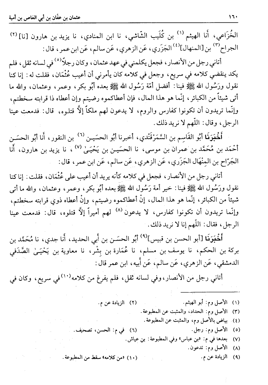 الخزاعي أنا الهيثم (1) بن كليب الشاشي أنا ابن المنادي أنا يزيد بن هارون أنا (2) الجراح (3) بن المنهال (4) الجزري عن الزهري عن سالم عن ابن عمر قال أتاني رجل من الأنصار فجعل يكلمني في عهد عثمان وكان رجلا (5) في لسانه ثقل فلم يكد ينقضي كلامه في سريع وجعل في كلامه كان يأمرني أن أعيب عثمان فقلت له إنا كنا نقول ورسول الله (صلى الله عليه وسلم) فينا أفضل أمة رسول الله (صلى الله عليه وسلم) بعده أبو بكر وعمر وعثمان والله ما أتى شيئا من الكبائر إنما هو هذا المال فإن أعطاكموه رضيتم وإن أعطاه ذا قرابته سخطتم وإنما تريدون أن تكونوا كفارس والروم لا يدعون لهم ملكا إلا قتلوه قال فدمعت عينا الرجل وقال اللهم لا نريد ذلك أخبرنا أبو القاسم بن السمرقندي أخبرنا أبو الحسين (6) بن النقور أنا أبو الحسن أحمد بن محمد بن عمران بن موسى أنا الحسين بن يحيى (7) أنا يزيد بن هارون أنا الجراح بن المنهال الجزري عن الزهري عن سالم عن ابن عمر قال أتاني رجل من الأنصار فجعل في كلامه كأنه يريد أن أعيب على عثمان فقلت إنا كنا نقول ورسول الله (صلى الله عليه وسلم) فينا خير أمة رسول الله (صلى الله عليه وسلم) بعده أبو بكر وعمر وعثمان والله ما أتى شيئا من الكبائر إنما هو هذا المال إن أعطاكموه رضيتم وإن أعطاه ذوي قرابته سخطتم وإنما تريدون أن تكونوا كفارس لا يدعون (8) لهم أميرا إلا قتلوه قال فدمعت عينا الرجل فقال اللهم لا نريد ذلك أخبرنا أبو الحسن بن قبيس (9) أبو الحسن بن أبي الحديد أنا جدي أنا محمد بن بركة بن الحكم أنا يوسف بن مسلم أنا عمارة بن بشر أنا معاوية بن يحيى الصدفي الدمشقي عن الزهري عن سالم عن أبيه ابن عمر قال أتاني رجل من الأنصار وفي لسانه ثقل فلم يفرغ من كلامه (10) في سريع وكان في