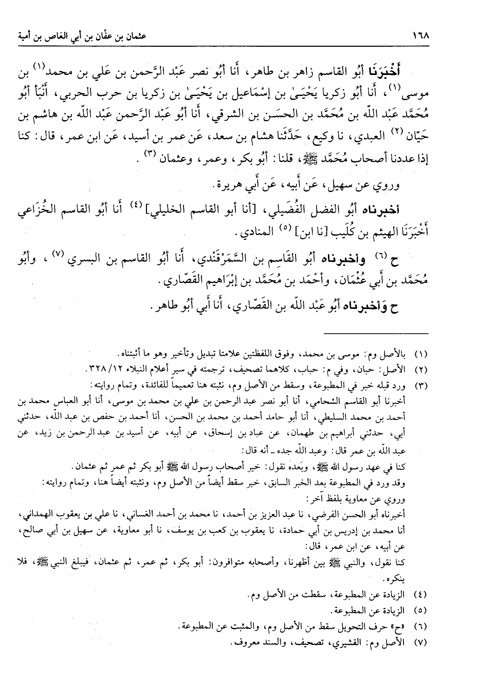 أخبرنا أبو القاسم زاهر بن طاهر أنا أبو نصر عبد الرحمن بن علي بن محمد بن موسى (1) أنا أبو زكريا يحيى بن إسماعيل بن يحيى بن زكريا بن حرب الحربي أنبأ أبو محمد عبد الله بن محمد بن الحسن بن الشرقي أنا أبو عبد الرحمن عبد الله بن هاشم بن حيان (2) العبدي أنا وكيع حدثنا هشام بن سعد عن عمر بن أسيد عن ابن عمر قال كنا إذا عددنا أصحاب محمد (صلى الله عليه وسلم) قلنا أبو بكر وعمر وعثمان (3) وروي عن سهيل عن أبيه عن أبي هريرة أخبرناه أبو الفضل الفضيلي أنا أبو القاسم الخليلي (4) أنا أبو القاسم الخزاعي أخبرنا الهيثم بن كليب أنا ابن (5) المنادي ح (6) وأخبرناه أبو القاسم بن السمرقندي أنا أبو القاسم بن البسري (7) وأبو محمد بن أبي عثمان وأحمد بن محمد بن إبراهيم القصاري ح وأخبرناه أبو عبد الله بن القصاري أنا أبي أبو طاهر