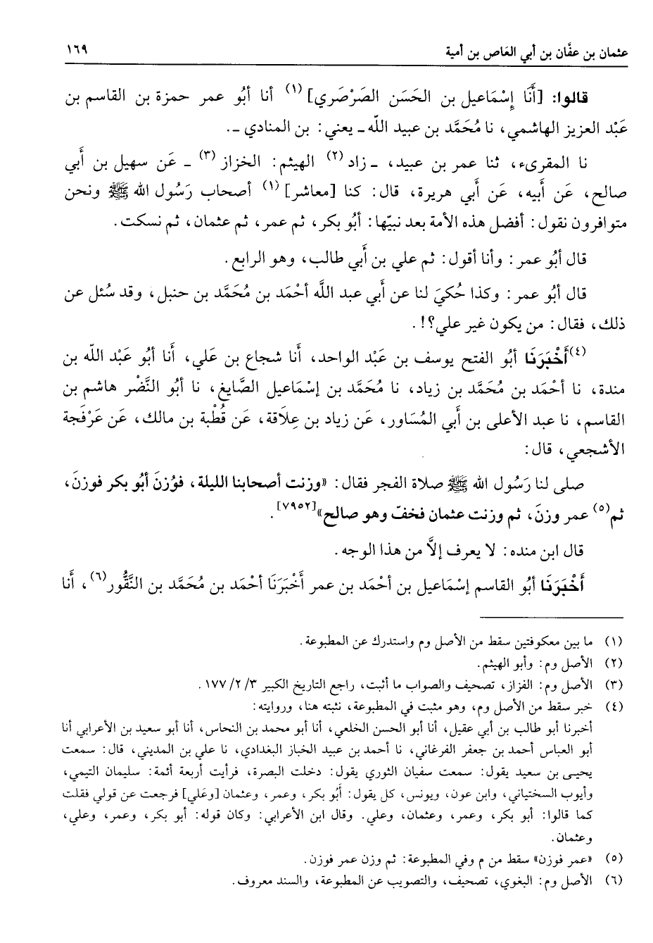 قالوا أنا إسماعيل بن الحسن الصرصري (1) أنا أبو عمر حمزة بن القاسم بن عبد العزيز الهاشمي أنا محمد بن عبيد الله يعني بن المنادي أنا المقرئ ثنا عمر بن عبيد زاد (2) الهيثم الخزاز (3) عن سهيل بن أبي صالح عن أبيه عن أبي هريرة قال كنا معاشر (1) أصحاب رسول الله (صلى الله عليه وسلم) ونحن متوافرون نقول أفضل هذه الأمة بعد نبيها أبو بكر ثم عمر ثم عثمان ثم نسكت قال أبو عمر وأنا أقول ثم علي بن أبي طالب وهو الرابع قال أبو عمر وكذا حكي لنا عن أبي عبد الله أحمد بن محمد بن حنبل وقد سئل عن ذلك فقال من يكون غير علي (4) أخبرنا أبو الفتح يوسف بن عبد الواحد أنا شجاع بن علي أنا أبو عبد الله بن مندة أنا أحمد بن محمد بن زياد أنا محمد بن إسماعيل الصايغ أنا أبو النضر هاشم بن القاسم أنا عبد الأعلى بن أبي المساور عن زياد بن علاقة عن قطبة بن مالك عن عرفجة الأشجعي قال صلى لنا رسول الله (صلى الله عليه وسلم) صلاة الفجر فقال وزنت أصحابنا الليلة فوزن أبو بكر فوزن ثم (5) عمر وزن ثم وزنت عثمان فخف وهو صالح