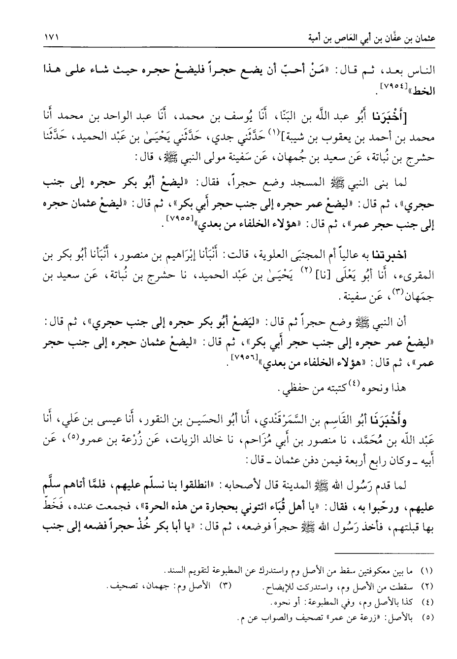 [7956] هذا ونحوه (4) كتبته من حفظي وأخبرنا أبو القاسم بن السمرقندي أنا أبو الحسين بن النقور أنا عيسى بن علي أنا عبد الله بن محمد أنا منصور بن أبي مزاحم أنا خالد الزيات عن زرعة بن عمرو عن أبيه وكان رابع أربعة فيمن دفن عثمان قال لما قدم رسول الله (صلى الله عليه وسلم) المدينة قال لأصحابه انطلقوا بنا نسلم عليهم فلما أتاهم سلم عليهم ورحبوا به فقال يا أهل قباء ائتوني بحجارة من هذه الحرة فجمعت عنده فخط بها قبلتهم فأخذ رسول الله (صلى الله عليه وسلم) حجرا فوضعه ثم قال يا أبا بكر خذ حجرا فضعه إلى جنب