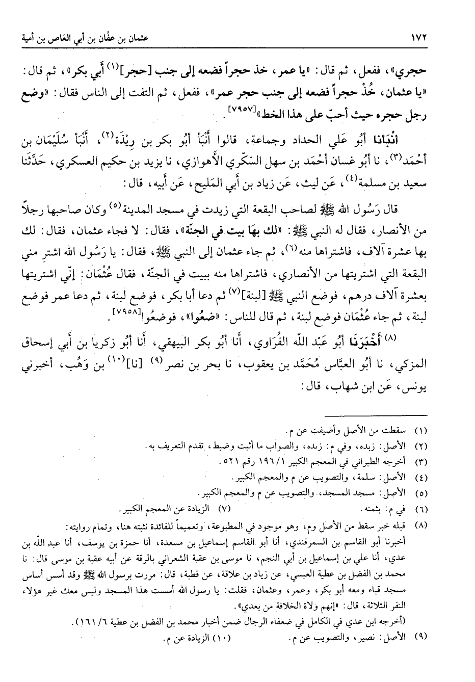 [7957] أنبأنا أبو علي الحداد وجماعة قالوا أنبأ أبو بكر بن ريذة (2) أنبأ سليمان بن أحمد (3) أنا أبو غسان أحمد بن سهل السكري الأهوازي أنا يزيد بن حكيم العسكري حدثنا سعيد بن مسلمة (4) عن ليث عن زياد بن أبي المليح عن أبيه قال قال رسول الله (صلى الله عليه وسلم) لصاحب البقعة التي زيدت في مسجد المدينة (5) وكان صاحبها رجلا من الأنصار فقال له النبي (صلى الله عليه وسلم) لك بها بيت في الجنة فقال لا فجاء عثمان فقال لك بها عشرة آلاف فاشتراها منه (6) ثم جاء عثمان إلى النبي (صلى الله عليه وسلم) فقال يا رسول الله اشتر مني البقعة التي اشتريتها من الأنصاري فاشتراها منه ببيت في الجنة فقال عثمان إني اشتريتها بعشرة آلاف درهم فوضع النبي (صلى الله عليه وسلم) لبنة (7) ثم دعا أبا بكر فوضع لبنة ثم دعا عمر فوضع لبنة ثم جاء عثمان فوضع لبنة ثم قال للناس ضعوا فوضعوا