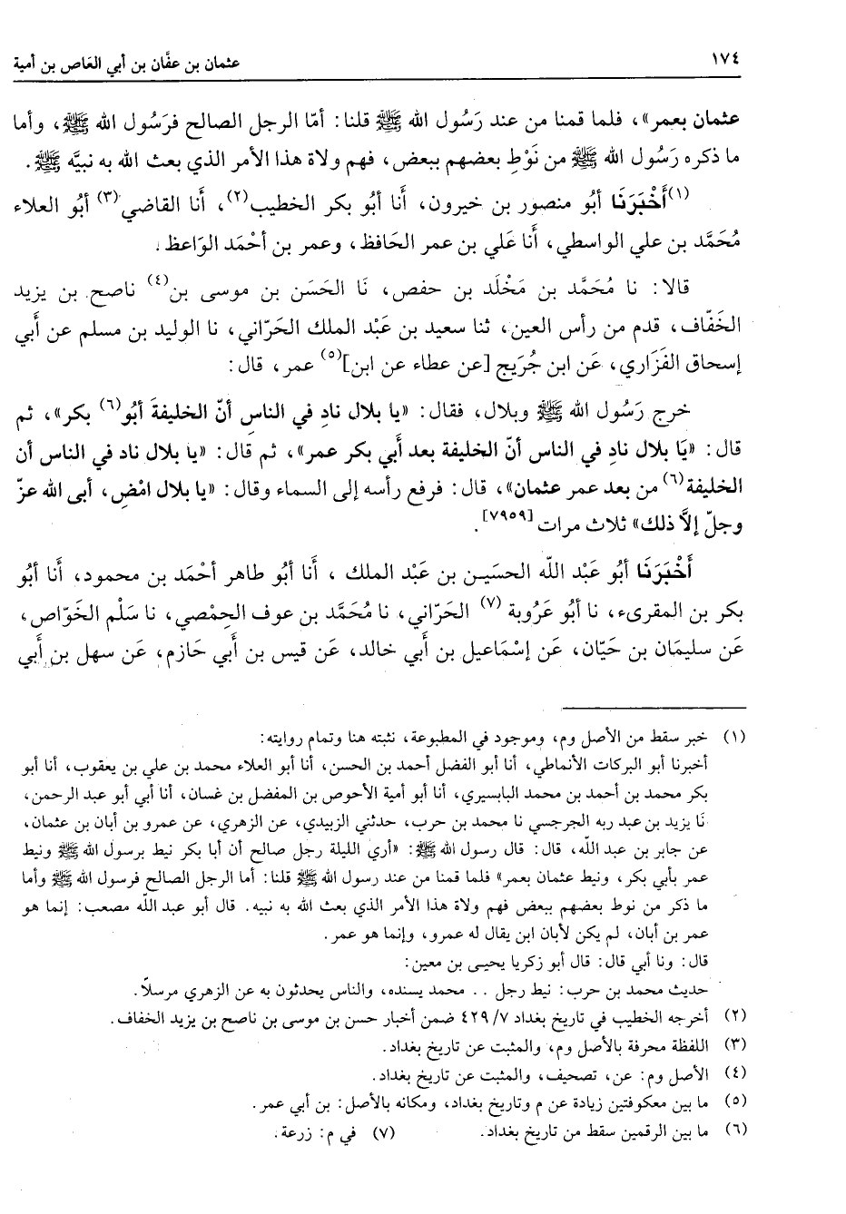عثمان بعمر فلما قمنا من عند رسول الله (صلى الله عليه وسلم) قلنا أما الرجل الصالح فرسول الله (صلى الله عليه وسلم) وأما ما ذكره رسول الله (صلى الله عليه وسلم) من نوط بعضهم ببعض فهم ولاة هذا الأمر الذي بعث الله به نبيه (صلى الله عليه وسلم) (1) أخبرنا أبو منصور بن خيرون أنا أبو بكر الخطيب (2) أنا القاضي (3) أبو العلاء محمد بن علي الواسطي أنا علي بن عمر الحافظ وعمر بن أحمد الواعظ قالا أنا محمد بن مخلد بن حفص أنا الحسن بن موسى بن (4) ناصح بن يزيد الخفاف قدم من رأس العين ثنا سعيد بن عبد الملك الحراني أنا الوليد بن مسلم عن أبي إسحاق الفزاري عن ابن جريح عن عطاء عن ابن (5) عمر قال خرج رسول الله (صلى الله عليه وسلم) وبلال فقال يا بلال ناد في الناس أن الخليفة أبو (6) بكر ثم قال يا بلال ناد في الناس أن الخليفة بعد أبي بكر عمر ثم قال يا بلال ناد في الناس أن الخليفة (6) من بعد عمر عثمان قال فرفع رأسه إلى السماء وقال يا بلال امض أبى الله عز وجل إلا ذلك ثلاث مرات