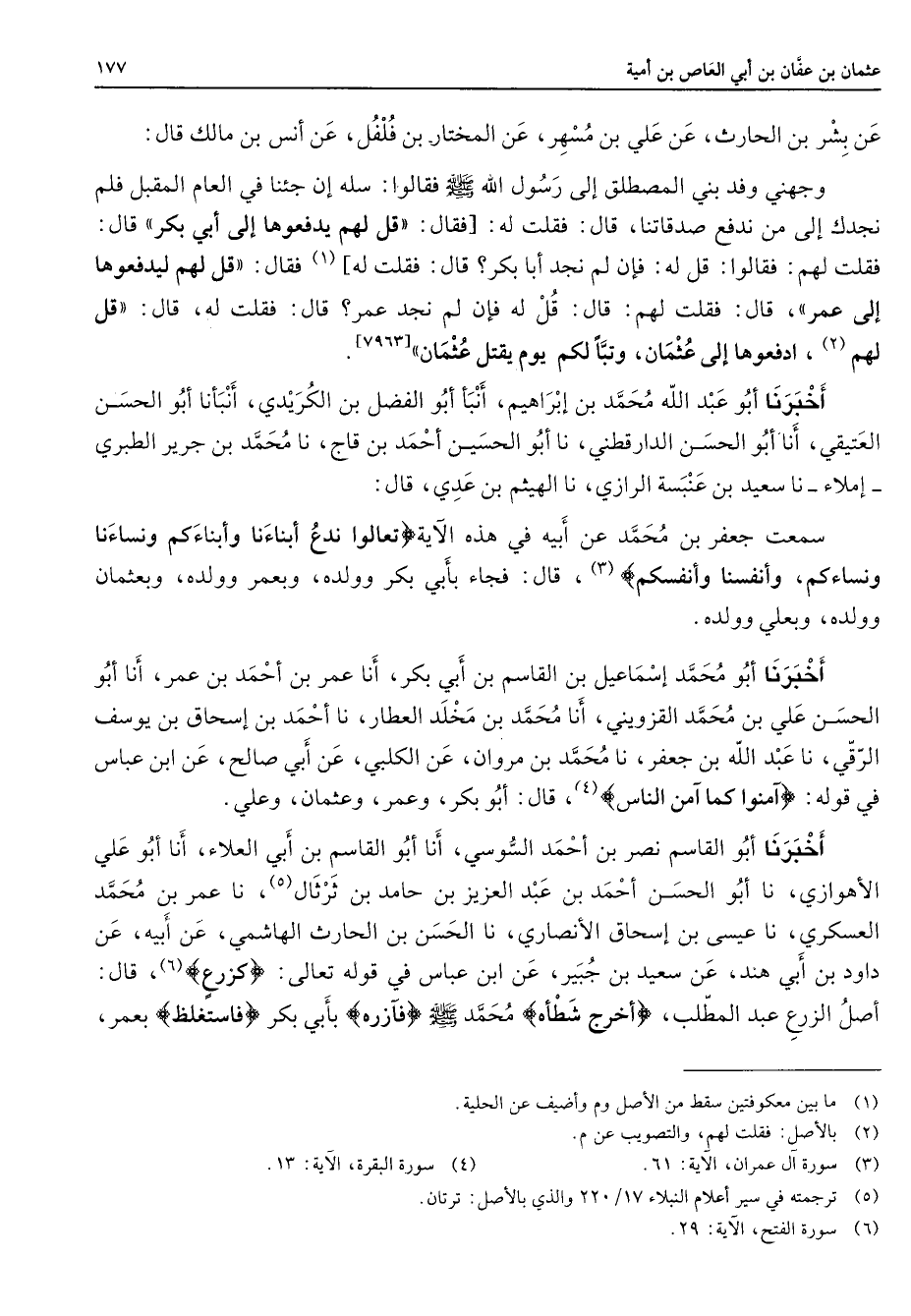 [7963] أخبرنا أبو عبد الله محمد بن إبراهيم أنبأ أبو الفضل بن الكريدي أنبأنا أبو الحسن العتيقي أنا أبو الحسن الدارقطني أنا أبو الحسين أحمد بن قاج أنا محمد بن جرير الطبري إملاء أنا سعيد بن عنبسة الرازي أنا الهيثم بن عدي قال سمعت جعفر بن محمد عن أبيه في هذه الآية " تعالوا ندع أبناءنا وأبناءكم ونساءنا ونساءكم وأنفسنا وأنفسكم " (3) قال فجاء بأبي بكر وولده وبعمر وولده وبعثمان وولده وبعلي وولده أخبرنا أبو محمد إسماعيل بن القاسم بن أبي بكر أنا عمر بن أحمد بن عمر أنا أبو الحسن علي بن محمد القزويني أنا محمد بن مخلد العطار أنا أحمد بن إسحاق بن يوسف الرقي أنا عبد الله بن جعفر أنا محمد بن مروان عن الكلبي عن أبي صالح عن ابن عباس في قوله " آمنوا كما آمن الناس " (4) قال أبو بكر وعمر وعثمان وعلي أخبرنا أبو القاسم نصر بن أحمد السوسي أنا أبو القاسم بن أبي العلاء أنا أبو علي الأهوازي أنا أبو الحسن أحمد بن عبد العزيز بن حامد بن ثرثال (5) أنا عمر بن محمد العسكري أنا عيسى بن إسحاق الأنصاري أنا الحسن بن الحارث الهاشمي عن أبيه عن داود بن أبي هند عن سعيد بن جبير عن ابن عباس في قوله تعالى " كزرع " (6) قال أصل الزرع عبد المطلب " أخرج شطأه " محمد (صلى الله عليه وسلم) " " فآزره " بأبي بكر " فاستغلظ " بعمر "