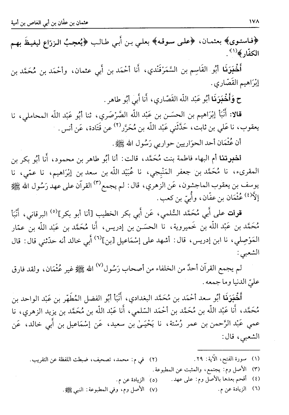 " فاستوى " بعثمان " على سوقه " بعلي بن أبي طالب " يعجب الزراع ليغيظ بهم الكفار " (1) أخبرنا أبو القاسم بن السمرقندي أنا أحمد بن أبي عثمان وأحمد بن محمد بن إبراهيم القصاري ح وأخبرنا أبو عبد الله القصاري أنا أبي أبو طاهر قالا أنبأ إبراهيم بن الحسن بن عبد الله الصرصري ثنا أبو عبد الله المحاملي أنا يعقوب أنا علي بن ثابت حدثني عبد الله بن محرر (2) عن قتادة عن أنس أن عثمان أحد الحواريين حواريي رسول الله (صلى الله عليه وسلم) أخبرتنا أم البهاء فاطمة بنت محمد قالت أنا أبو طاهر بن محمود أنا أبو بكر بن المقرئ أنا محمد بن جعفر المنبجي أنا عبيد الله بن سعد بن إبراهيم أنا عمي أنا يوسف بن يعقوب الماجشون عن الزهري قال لم يجمع (3) القرآن على عهد رسول الله (صلى الله عليه وسلم) إلا (4) عثمان بن عفان وأبي بن كعب قرأت على أبي محمد السلمي عن أبي بكر (5) الخطيب أنا أبو بكر البرقاني أنبأ محمد بن عبد الله بن خميروية أنا الحسن بن إدريس أنا محمد بن عبد الله بن عمار الموصلي أنا ابن إدريس قال أشهد على إسماعيل بن (6) أبي خالد أنه حدثني قال قال الشعبي لم يجمع القرآن أحد من الخلفاء من أصحاب رسول (7) الله (صلى الله عليه وسلم) غير عثمان ولقد فارق علي الدنيا وما جمعه أخبرنا أبو سعد أحمد بن محمد البغدادي أنبأ أبو الفضل المطهر بن عبد الواحد بن محمد أنا عبد الله بن محمد بن أحمد السلمي أنا عبد الله بن محمد بن يزيد الزهري أنا عمي عبد الرحمن بن عمر رستة أنا يحيى بن سعيد عن إسماعيل بن أبي خالد عن الشعبي قال