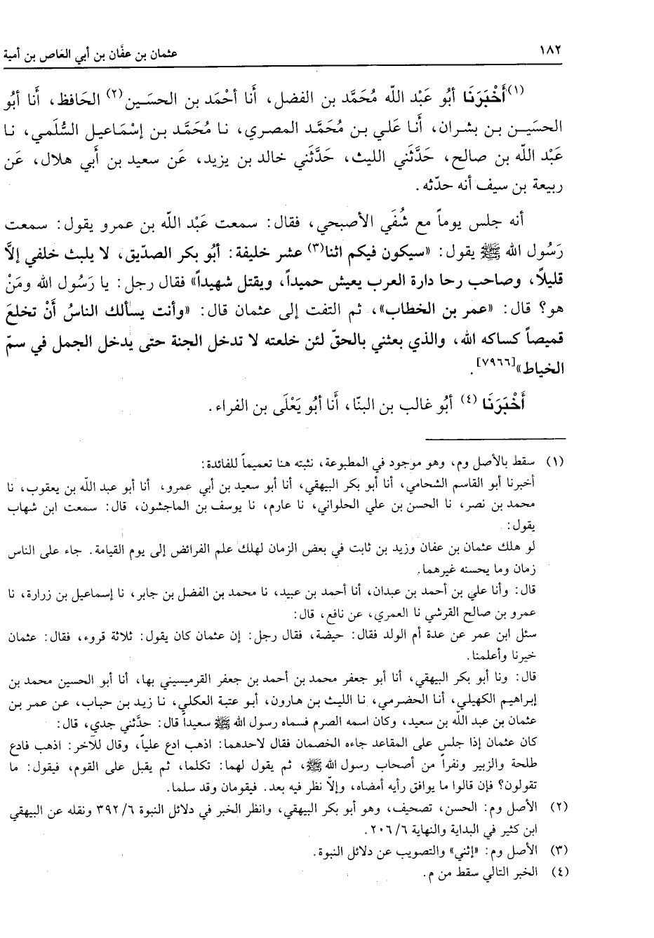 (1) أخبرنا أبو عبد الله محمد بن الفضل أنا أحمد بن الحسين (2) الحافظ أنا أبو الحسين بن بشران أنا علي بن محمد المصري أنا محمد بن إسماعيل السلمي أنا عبد الله بن صالح حدثني الليث حدثني خالد بن يزيد عن سعيد بن أبي هلال عن ربيعة بن سيف أنه حدثه أنه جلس يوما مع شفي الأصبحي فقال سمعت عبد الله بن عمرو يقول سمعت رسول الله (صلى الله عليه وسلم) يقول سيكون فيكم اثنا (3) عشر خليفة أبو بكر الصديق لا يلبث خلفي إلا قليلا وصاحب رحا دارة العرب يعيش حميدا ويقتل شهيدا فقال رجل يا رسول الله ومن هو قال عمر بن الخطاب ثم التفت إلى عثمان قال وأنت يسألك الناس أن تخلع قميصا كساكه الله والذي بعثني بالحق لئن خلعته لا تدخل الجنة حتى يدخل الجمل في سم الخياط