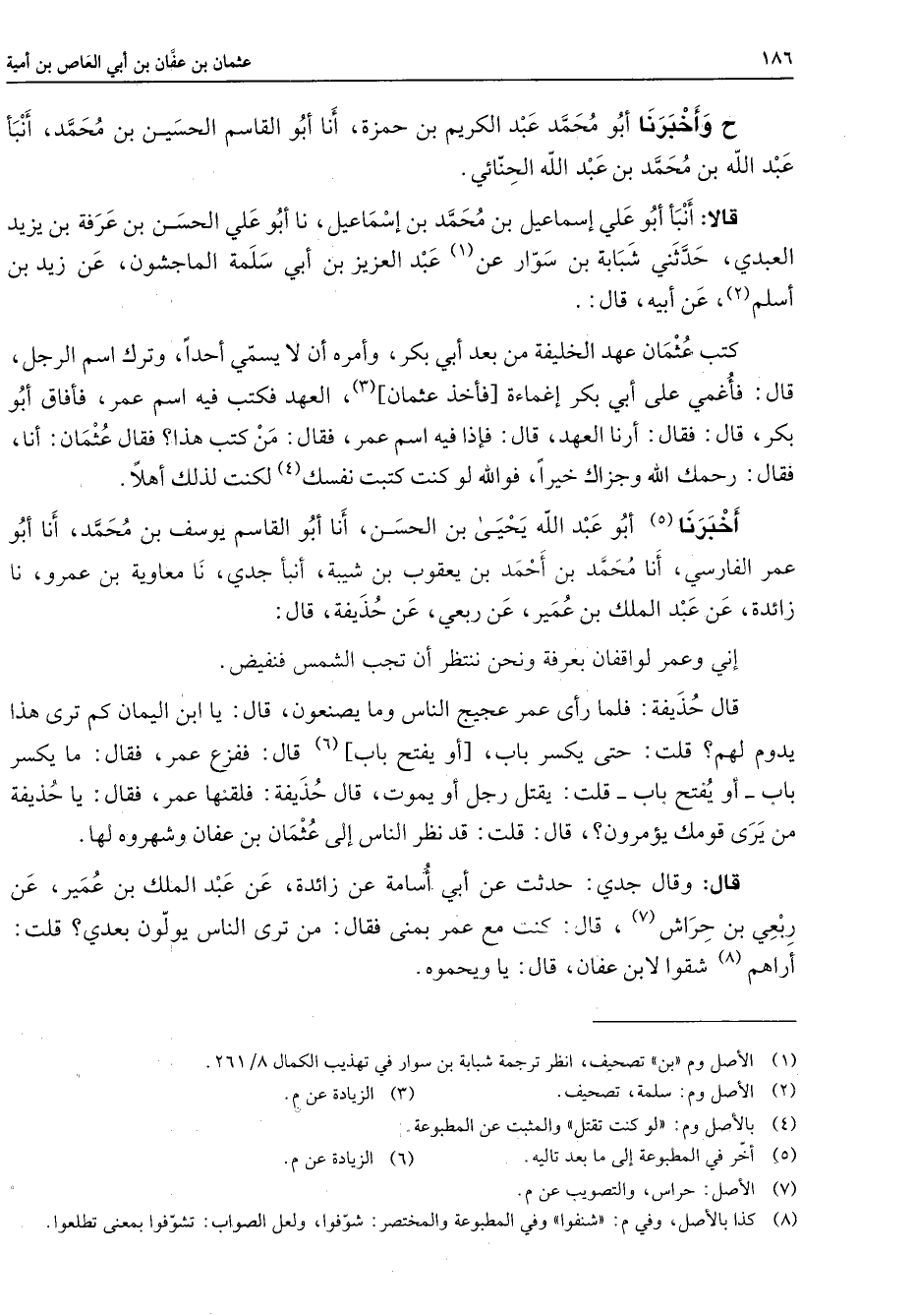 ح وأخبرنا أبو محمد عبد الكريم بن حمزة أنا أبو القاسم الحسين بن محمد أنبأ عبد الله بن محمد بن عبد الله الحنائي قالا أنبأ أبو علي إسماعيل بن محمد بن إسماعيل أنا أبو علي الحسن بن عرفة بن يزيد العبدي حدثني شبابة بن سوار عن (1) عبد العزيز بن أبي سلمة الماجشون عن زيد بن أسلم (2) عن أبيه قال كتب عثمان عهد الخليفة من بعد أبي بكر وأمره أن لا يسمي أحدا وترك اسم الرجل قال فأغمي على أبي بكر إغماءة فأخذ عثمان (3) العهد فكتب فيه اسم عمر فأفاق أبو بكر قال فقال أرنا العهد قال فإذا فيه اسم عمر فقال من كتب هذا فقال عثمان أنا فقال رحمك الله وجزاك خيرا فوالله لو كنت كتبت نفسك (4) لكنت لذلك أهلا أخبرنا (5) أبو عبد الله يحيى بن الحسن أنا أبو القاسم يوسف بن محمد أنا أبو عمر الفارسي أنا محمد بن أحمد بن يعقوب بن شيبة أنبأ جدي أنا معاوية بن عمرو أنا زائدة عن عبد الملك بن عمير عن ربعي عن حذيفة قال إني وعمر لواقفان بعرفة ونحن ننتظر أن تجب الشمس فنفيض قال حذيفة فلما رأى عمر عجيج الناس وما يصنعون قال يا ابن اليمان كم ترى هذا يدوم لهم قلت حتى يكسر باب أو يفتح باب (6) قال ففزع عمر فقال ما يكسر باب أو يفتح باب قلت يقتل رجل أو يموت قال حذيفة فلقنها عمر فقال يا حذيفة من يرى قومك يؤمرون قال قلت قد نظر الناس إلى عثمان بن عفان وشهروه لها قال وقال جدي حدثت عن أبي أسامة عن زائدة عن عبد الملك بن عمير عن ربعي بن حراش (7) قال كنت مع عمر بمنى فقال من ترى الناس يولون بعدي قلت أراهم (8) شقوا لابن عفان قال يا ويحموه