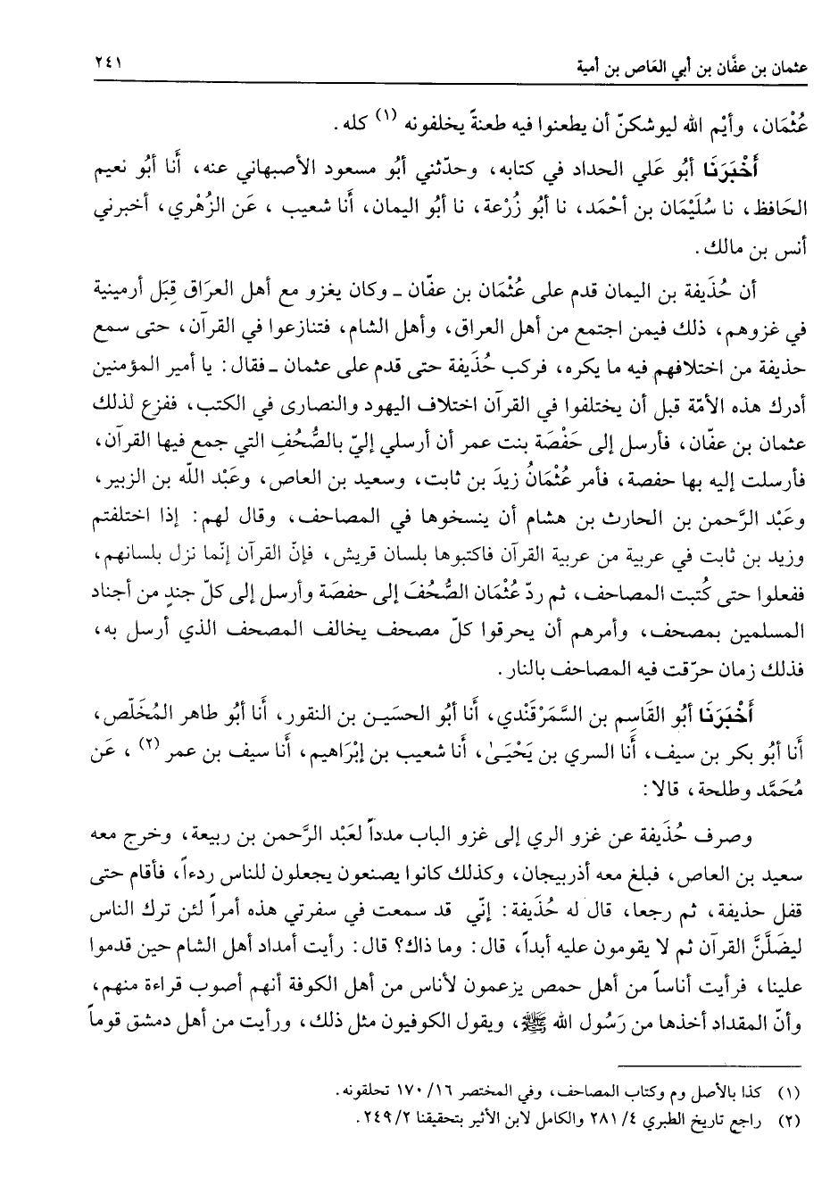 عثمان وأيم الله ليوشكن أن يطعنوا فيه طعنة يخلفونه (1) كله أخبرنا أبو علي الحداد في كتابه وحدثني أبو مسعود الأصبهاني عنه أنا أبو نعيم الحافظ نا سليمان بن أحمد نا أبو زرعة نا أبو اليمان أنا شعيب عن الزهري أخبرني أنس بن مالك أن حذيفة بن اليمان قدم على عثمان بن عفان وكان يغزو مع أهل العراق قبل أرمينية في غزوهم ذلك فيمن اجتمع من أهل العراق وأهل الشام فتنازعوا في القرآن حتى سمع حذيفة من اختلافهم فيه ما يكره فركب حذيفة حتى قدم على عثمان فقال يا أمير المؤمنين أدرك هذه الأمة قبل أن يختلفوا في القرآن اختلاف اليهود والنصارى في الكتب ففزع لذلك عثمان بن عفان فأرسل إلى حفصة بنت عمر أن أرسلي إلي بالصحف التي جمع فيها القرآن فأرسلت إليه بها حفصة فأمر عثمان زيد بن ثابت وسعيد بن العاص وعبد الله بن الزبير وعبد الرحمن بن الحارث بن هشام أن ينسخوها في المصاحف وقال لهم إذا اختلفتم وزيد بن ثابت في عربية من عربية القرآن فاكتبوها بلسان قريش فإن القرآن إنما نزل بلسانهم ففعلوا حتى كتبت المصاحف ثم رد عثمان الصحف إلى حفصة وأرسل إلى كل جند من أجناد المسلمين بمصحف وأمرهم أن يحرقوا كل مصحف يخالف المصحف الذي أرسل به فذلك زمان حرقت فيه المصاحف بالنار أخبرنا أبو القاسم بن السمرقندي أنا أبو الحسين بن النقور أنا أبو طاهر المخلص أنا أبو بكر بن سيف أنا السري بن يحيى أنا شعيب بن إبراهيم أنا سيف بن عمر (2) عن محمد وطلحة قال وصرف حذيفة عن غزو الري إلى غزو الباب مددا لعبد الرحمن بن ربيعة وخرج معه سعيد بن العاص فبلغ معه أذربيجان وكذلك كانوا يصنعون يجعلون للناس ردءا فأقام حتى قفل حذيفة ثم رجعا قال له حذيفة إني قد سمعت في سفرتي هذه أمرا لئن ترك الناس ليضلن القرآن ثم لا يقومون عليه أبدا قال وما ذاك قال رأيت أمداد أهل الشام حين قدموا علينا فرأيت أناسا من أهل حمص يزعمون لأناس من أهل الكوفة أنهم أصوب قراءة منهم وأن المقداد أخذها من رسول الله (صلى الله عليه وسلم) ويقول الكوفيون مثل ذلك ورأيت من أهل دمشق قوما