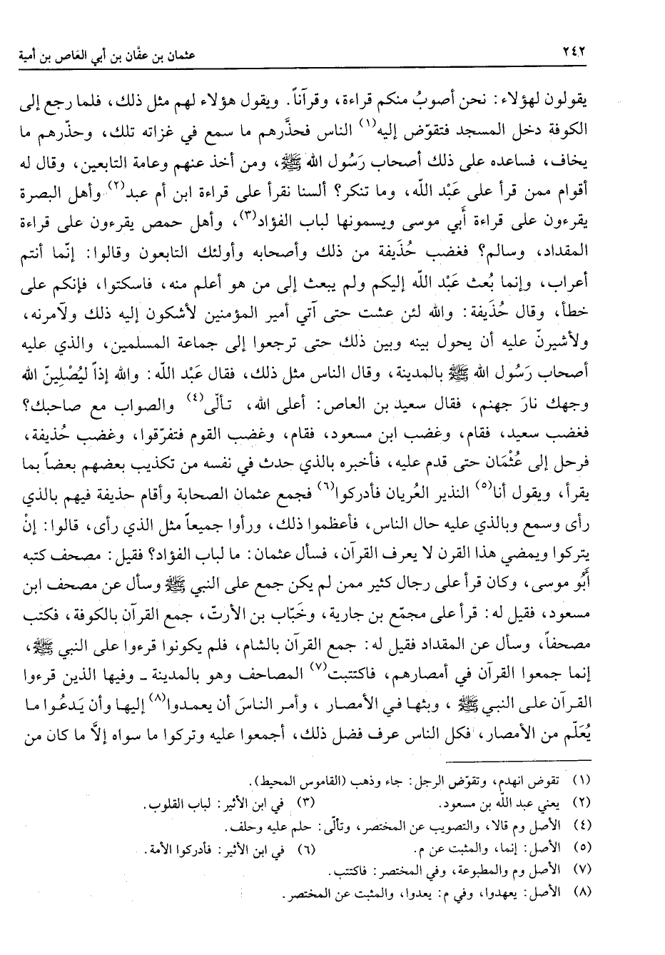 يقولون لهؤلاء نحن أصوب منكم قراءة وقرآنا ويقول هؤلاء لهم مثل ذلك فلما رجع إلى الكوفة دخل المسجد فتقوض إليه (1) الناس فحذرهم ما سمع في غزاته تلك وحذرهم ما يخاف فساعده على ذلك أصحاب رسول الله (صلى الله عليه وسلم) ومن أخذ عنهم وعامة التابعين وقال له أقوام ممن قرأ على عبد الله وما تنكر ألسنا نقرأ على قراءة ابن أم عبد (2) وأهل البصرة يقرءون على قراءة أبي موسى ويسمونها لباب الفؤاد (3) وأهل حمص يقرءون على قراءة المقداد وسالم فغضب حذيفة من ذلك وأصحابه وأولئك التابعون وقالوا إنما أنتم أعراب وإنما بعث عبد الله إليكم ولم يبعث إلى من هو أعلم منه فاسكتوا فإنكم على خطأ وقال حذيفة والله لئن عشت حتى آتي أمير المؤمنين لأشكون إليه ذلك ولآمرنه ولأشيرن عليه أن يحول بينه وبين ذلك حتى ترجعوا إلى جماعة المسلمين والذي عليه أصحاب رسول الله (صلى الله عليه وسلم) بالمدينة وقال الناس مثل ذلك فقال عبد الله والله إذا ليصلين الله وجهك نار جهنم فقال سعيد بن العاص أعلى الله تألى (4) والصواب مع صاحبك فغضب سعيد فقام وغضب ابن مسعود فقام وغضب القوم فتفرقوا وغضب حذيفة فرحل إلى عثمان حتى قدم عليه فأخبره بالذي حدث في نفسه من تكذيب بعضهم بعضا بما يقرأ ويقول أنا (5) النذير العريان فأدركوا (6) فجمع عثمان الصحابة وأقام حذيفة فيهم بالذي رأى وسمع وبالذي عليه حال النسا فأعظموا ذلك ورأوا جميعا مثل الذي رأى قالوا إن يتركوا ويمضي هذا القرن لا يعرف القرآن فسأل عثمان ما لباب الفؤاد فقيل مصحف كتبه أبو موسى وكان قرأ على رحال كثير ممن لم يكن جمع على النبي (صلى الله عليه وسلم) وسأل عن مصحف ابن مسعود فقيل له قرأ على مجمع بن جارية وخباب بن الأرت جمع القرآن بالكوفة فكتب مصحفا وسال عن المقداد فقيل له جمع القرآن بالشام فلم يكونوا قرءوا على النبي (صلى الله عليه وسلم) إنما جمعوا القرآن في أمصارهم فاكتتبت (7) المصاحف وهو بالمدينة وفيها الذين قرءوا القرآن على النبي (صلى الله عليه وسلم) وبثها في الأمصار وأمر الناس أن يعمدوا (8) إليها وأن يدعوا ما يعلم من الأمصار فكل الناس عرف فضل ذلك أجمعوا عليه وتركوا ما سواه إلا ما كان من