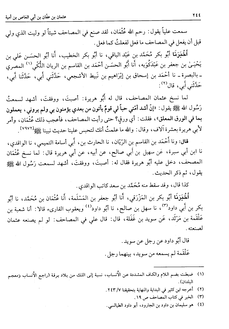 [7972] قال ونا أحمد بن القاسم بن الريان نا الحارث بن أبي أسامة التميمي نا الواقدي نا ابن أبي سبرة عن سهيل بن أبي صالح عن أبيه عن أبي هريرة قال لما نسخ عثمان المصحف دخل عليه أبو هريرة فقال له أصبت ووفقت أشهد لسمعت رسول الله (صلى الله عليه وسلم) يقول ثم ذكر الحديث كذا قال وقد سقط منه محمد بن سعد كاتب الواقدي أخبرنا أبو بكر بن المزرقي أنا أبو جعفر بن المسلمة أنا عثمان بن محمد نا أبو بكر بن أبي داود (3) نا سهل بن صالح نا أبو داود (4) ويعقوب القارئ قالا أنا شعبة بن علقمة بن مرثد عن سويد بن غفلة قال قال علي في المصاحف لو لم يصنعه عثمان لصنعته قال أبو داود عن رجل عن سويد علقمة لم يسمعه من سويد بينهما رجل