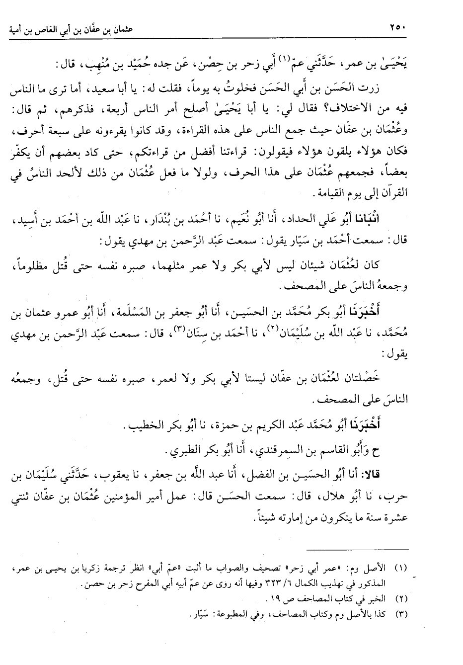 يحيى بن عمر حدثني عم (1) أبي زحر بن حصن عن جده حميد بن منهب قال زرت الحسن بن أبي الحسن فخلوت به يوما فقلت له يا أبا سعيد أما ترى ما الناس فيه من الاختلاف فقال لي يا أبا يحيى أصلح أمر الناس أربعة فذكرهم ثم قال وعثمان بن عفان حيث جمع الناس على هذه القراءة وقد كانوا يقرءونه على سبعة أحرف فكان هؤلاء يلقون هؤلاء فيقولون قراءتنا أفضل من قراءتكم حتى كاد بعضهم أن يكفر بعضا فجمعهم عثمان على هذا الحرف ولولا ما فعل عثمان من ذلك لألحد الناس في القرآن إلى يوم القيامة أنبأنا أبو علي الحداد أنا أبو نعيم نا أحمد بن بندار نا عبد الله بن أحمد بن أسيد قال سمعت أحمد بن سيار يقول سمعت عبد الرحمن بن مهدي يقول كان لعثمان شيئان ليس لأبي بكر ولا عمر مثلهما صبره نفسه حتى قتل مظلوما وجمعه الناس على المصحف أخبرنا أبو بكر محمد بن الحسين أنا أبو جعفر بن المسلمة أنا أبو عمرو عثمان بن محمد نا عبد الله بن سليمان (1) نا أحمد بن سنان (2) قال سمعت عبد الرحمن بن مهدي يقول خصلتان لعثمان بن عفان ليستا لأبي بكر ولا لعمر صبره نفسه حتى قتل وجمعه الناس على المصحف أخبرنا أبو محمد عبد الكريم بن حمزة نا أبو بكر الخطيب ح وأبو القاسم بن السمرقندي أنا أبو بكر الطبري قالا أنا أبو الحسين بن الفضل أنا عبد الله بن جعفر نا يعقوب حدثني سليمان بن حرب نا أبو هلال قال سمعت الحسن قال عمل أمير المؤمنين عثمان بن عفان ثنتي عشرة سنة ما ينكرون من إمارته شيئا