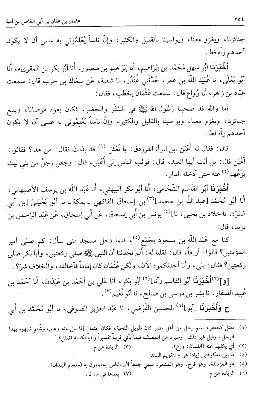 جنائزنا ويغزو معنا ويواسينا بالقليل والكثير وإن ناسا يعلموني به عسى أن لا يكون أحدهم رآه قط أخبرنا أبو سهل محمد بن إبراهيم أنا إبراهيم بن منصور أنا أبو بكر بن المقرئ أنا أبو يعلى نا عبيد الله بن عمر حدثني غندر نا شعبة عن سماك بن حرب قال سمعت عباد بن زاهر أنا رواع قال سمعت عثمان يخطب فقال أما والله قد صحبنا رسول الله (صلى الله عليه وسلم) في السفر والحضر فكان يعود مرضانا ويتبع جنائزنا ويغزو معنا ويواسينا بالقليل والكثير وإن ناسا يعلموني به عسى أن لا يكون أحدهم رآه قط قال فقال له أعين ابن امرأة الفرزدق يا نعثل (1) قد بدلت فقال من هذا فقالوا أعين قال بل أنت أيها العبد قال فوثب الناس إلى أعين قال وجعل رجل من بني ليث يزعهم (2) عنه حتى أدخله الدار أخبرنا أبو القاسم الشحامي أنا أبو بكر البيهقي أنا عبد الله بن يوسف الأصبهاني أنا أبو محمد عبد الله بن محمد (3) بن إسحاق الفاكهي بمكة نا أبو يحيى ابن أبي مسرة نا خلاد بن يحيى نا (4) يونس بن أبي إسحاق عن أبي إسحاق عن عبد الرحمن بن يزيد قال كنا مع عبد الله بن مسعود بجمع (5) فلما دخل مسجد منى سأل كم صلى أمير المؤمنين قالوا أربعا قال فقلنا له ألم تحدثنا أن النبي (صلى الله عليه وسلم) صلى ركعتين وأبا بكر صلى ركعتين فقال بلى وأنا أحدثكموه الآن ولكن عثمان كان إماما فأخالفه والخلاف شر و (6) أخبرنا أبو القاسم أنا (6) أبو بكر أنا علي بن أحمد بن عبدان أنا أحمد بن عبيد الصفار نا بشر بن موسى بن صالح نا أبو نعيم (7) ح وأخبرنا أبو (6) الحسن الفرضي نا عبد العزيز الصوفي نا أبو محمد بن أبي