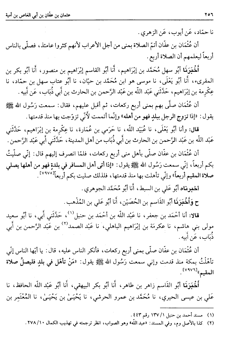 نا حماد عن أيوب عن الزهري أن عثمان بن عفان أتم الصلاة بمنى من أجل الأعراب لأنهم كثروا عامئذ فصلى بالناس أربعا ليعلمهم أن الصلاة أربع أخبرنا أبو سهل محمد بن إبراهيم أنا أبو القاسم إبراهيم بن منصور أنا أبو بكر بن المقرئ أنا أبو يعلى نا موسى هو ابن محمد بن حيان نا أبو عتاب سهل بن حماد نا عكرمة بن إبراهيم حدثني عبد الله بن عبد الرحمن بن الحارث بن أبي ذباب عن أبيه أن عثمان صلى بهم بمنى أربع ركعات ثم أقبل عليهم فقال سمعت رسول الله (صلى الله عليه وسلم) يقول إذا تزوج الرجل ببلد فهو من أهله وإنما أتممت لأني تزوجت بها منذ قدمتها قال وأنا أبو يعلى نا عبيد الله نا حرمي بن عمارة نا عكرمة بن إبراهيم حدثني عبد الله بن عبد الرحمن بن الحارث بن أبي ذباب من أهل المدينة حدثني أبي عبد الرحمن أن عثمان بن عفان صلى بأهل منى أربع ركعات فلما انصرف إليهم قال إني صليت بكم أربعا إني سمعت رسول الله (صلى الله عليه وسلم) يقول إذا أتى أهل المسافر في بلدة فهو من أهلها يصلي صلاة المقيم أربعا وإني تأهلت بها منذ قدمتها فلذلك صليت بكم أربعا