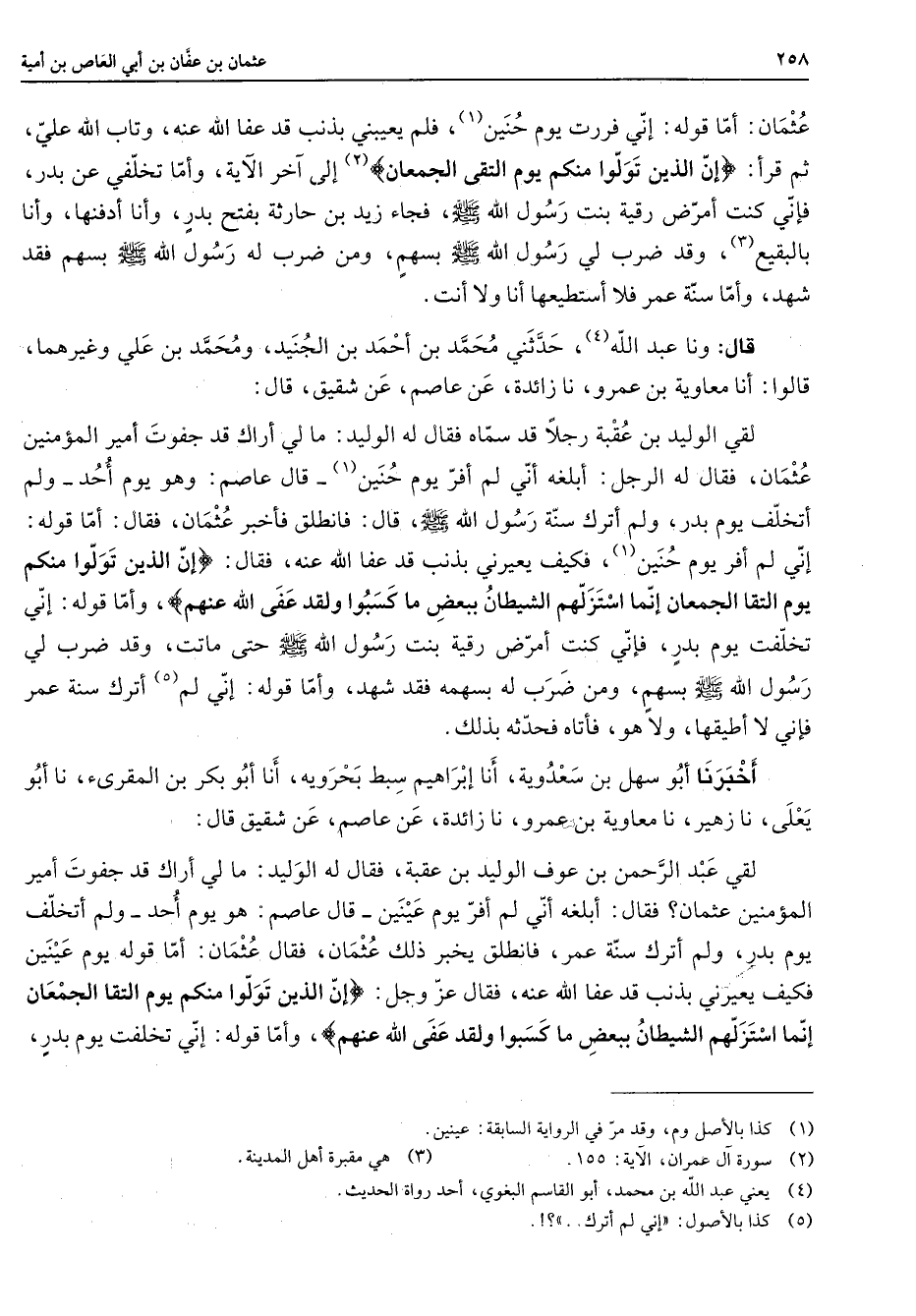 عثمان أما قوله إني فررت يوم حنين (1) فلم يعيبني بذنب قد عفا الله عنه وتاب الله علي ثم قرأ " إن الذين تولوا منكم يوم التقى الجمعان " (2) إلى آخر الآية وأما تخلفي عن بدر فإني كنت أمرض رقية بنت رسول الله (صلى الله عليه وسلم) فجاء زيد بن حارثة بفتح بدر وأنا أدفنها وأنا بالبقيع (3) وقد ضرب لي رسول الله (صلى الله عليه وسلم) بسهم ومن ضرب له رسول الله (صلى الله عليه وسلم) بسهم فقد شهد وأما سنة عمر فلا أستطيعها أنا ولا أنت قال ونا عبد الله (4) حدثني محمد بن أحمد بن الجنيد ومحمد بن علي وغيرهما قالوا أنا معاوية بن عمرو نا زائدة عن عاصم عن شقيق قال لقي الوليد بن عقبة رجلا قد سماه فقال له الوليد ما لي أراك قد جفوت أمير المؤمنين عثمان فقال له الرجل أبلغه أني لم أفر يوم حنين (1) قال عاصم وهو يوم أحد ولم أتخلف يوم بدر ولم أترك سنة رسول الله (صلى الله عليه وسلم) قال فانطلق فأخبر عثمان فقال أما قوله إني لم أفر يوم حنين (1) فكيف يعيرني بذنب قد عفا الله عنه فقال " إن الذين تولوا منكم يوم التقا الجمعان إنما استزلهم الشيطان ببعض ما كسبوا ولقد عفى الله عنهم " وأما قوله إني تخلفت يوم بدر فإني كنت أمرض رقية بنت رسول الله (صلى الله عليه وسلم) حتى ماتت وقد ضرب لي رسول الله (صلى الله عليه وسلم) بسهم ومن ضرب له بسهمه فقد شهد وأما قوله إني لم (5) أترك سنة عمر فإني لا أطيقها ولا هو فأتاه فحدثه بذلك أخبرنا أبو سهل بن سعدوية أنا إبراهيم سبط بحرويه أنا أبو بكر بن المقرئ نا أبو يعلى نا زهير نا معاوية بن عمرو نا زائدة عن عاصم عن شقيق قال لقي عبد الرحمن بن عوف الوليد بن عقبة فقال له الوليد ما لي أراك قد جفوت أمير المؤمنين عثمان فقال أبلغه أني لم أفر يوم عينين قال عاصم هو يوم أحد ولم أتخلف يوم بدر ولم أترك سنة عمر فانطلق يخبر ذلك عثمان فقال عثمان أما قوله يوم عينين فكيف يعيرني بذنب قد عفا الله عنه فقال عز وجل " إن الذين تولوا منكم يوم التقا الجمعان إنما استزلهم الشيطان ببعض ما كسبوا ولقد عفى الله عنهم " وأما قوله إني تخلفت يوم بدر