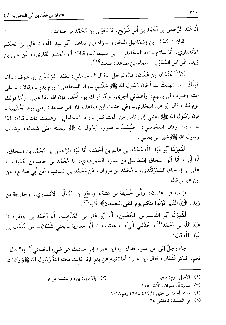 أنا عبد الرحمن بن أحمد بن أبي شريح أنا يحيى بن محمد بن صاعد قالا أنا محمد بن إسماعيل البخاري زاد ابن صاعد أبو عبد الله أنا علي بن الحكم الأنصاري أنا سلام زاد المحاملي بن سليمان وقالا أبو المنذر القارئ عن علي بن زيد عن ابن المسيب سماه ابن صاعد سعيدا (1) أن (2) عثمان بن عفان قال لرجل وقال المحاملي لعبد الرحمن بن عوف أما قولك ما شهدت بدرا فإن رسول الله (صلى الله عليه وسلم) خلفني زاد المحاملي يوم بدر وقالا على ابنته وضرب لي بسهم وأعطاني أجري وأما قولك يوم أحد فإن الله عفا عني وأما قولك يوم كذا قال أبو عبد البخاري وفي حديث ابن صاعد قال ابن صاعد يعني يوم الحديبية فإن رسول الله (صلى الله عليه وسلم) بعثني إلى ناس من المشركين زاد المحاملي وعلمت ذاك قال لما حبست وقال المحاملي احتبست ضرب رسول الله (صلى الله عليه وسلم) بيميه على شماله وشمال رسول الله (صلى الله عليه وسلم) خير من يميني أخبرنا أبو عبد الله محمد بن غانم بن أحمد أنا عبد الرحمن بن محمد بن إسحاق أنا أبي أنا أبو أسحاق إسماعيل بن عمرو السمرقندي أنا محمد بن حامد بن حميد أنا علي بن إسحاق السمرقندي أنا محمد بن مروان عن محمد بن السائب عن أبي صالح عن ابن عباس قال نزلت في عثمان وبي حذيفة بن عتبة ورافع بن المعلى الأنصاري وخارجة بن زيد " إن الذين تولوا منكم يوم التقى الجمعان " الآية (3) أخبرنا أبو القاسم بن الحصين أنا أبو علي بن المذهب أنا أحمد بن جعفر أنا عبد الله بن أحمد (4) حدثني أبي أنا هاشم أنا أبو معاوية يعني شيبان عن عثمان بن عبد الله قال جاء رجل إلى ابن عمر فقال يا ابن عمر إني سائلك عن شئ أتحدثني (5) به قال نعم فذكر عثمان فقال ابن عمر أما تغيبه عن بدر فإنه كانت تحته ابنة رسول الله (صلى الله عليه وسلم) وكانت