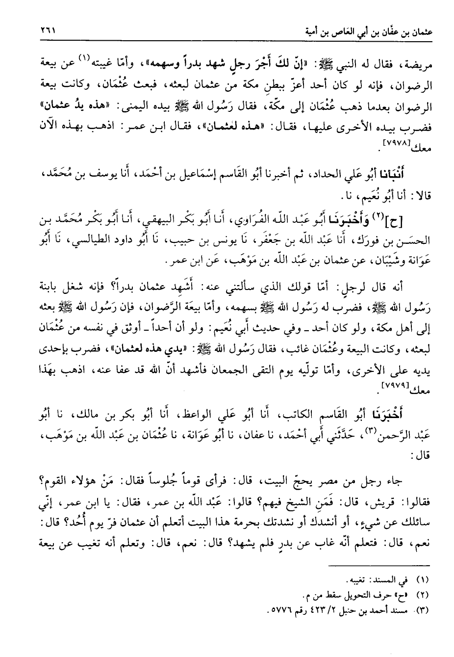 [7978] أنبأنا أبو علي الحداد ثم أخبرنا أبو القاسم إسماعيل بن أحمد أنا يوسف بن محمد قالا أنا أبو نعيم أنا ح (2) وأخبرنا أبو عبد الله الفراوي أنا أبو بكر البيهقي أنا أبو بكر محمد بن الحسن بن فورك أنا عبد الله بن جعفر أنا يونس بن حبيب أنا أبو داود الطيالسي أنا أبو عوانة وشيبان عن عثمان بن عبد الله بن موهب عن ابن عمر أنه قال لرجل أما قولك الذي سألتني عنه أشهد عثمان بدرا فإنه شغل بإبنة رسول الله (صلى الله عليه وسلم) فضرب له رسول الله (صلى الله عليه وسلم) بسهمه وأما بيعة الرضوان فإن رسول الله (صلى الله عليه وسلم) بعثه إلى أهل مكة ولو كان أحد وفي حديث أبي نعيم ولو أن أحدا أوثق في نفسه من عثمان لبعثه وكانت البيعة وعثمان غائب فقال رسول الله (صلى الله عليه وسلم) يدي هذه لعثمان فضرب بإحدى يديه على الأخرى وأما توليه يوم التقى الجمعان فأشهد أن الله قد عفا عنه اذهب بهذا معك