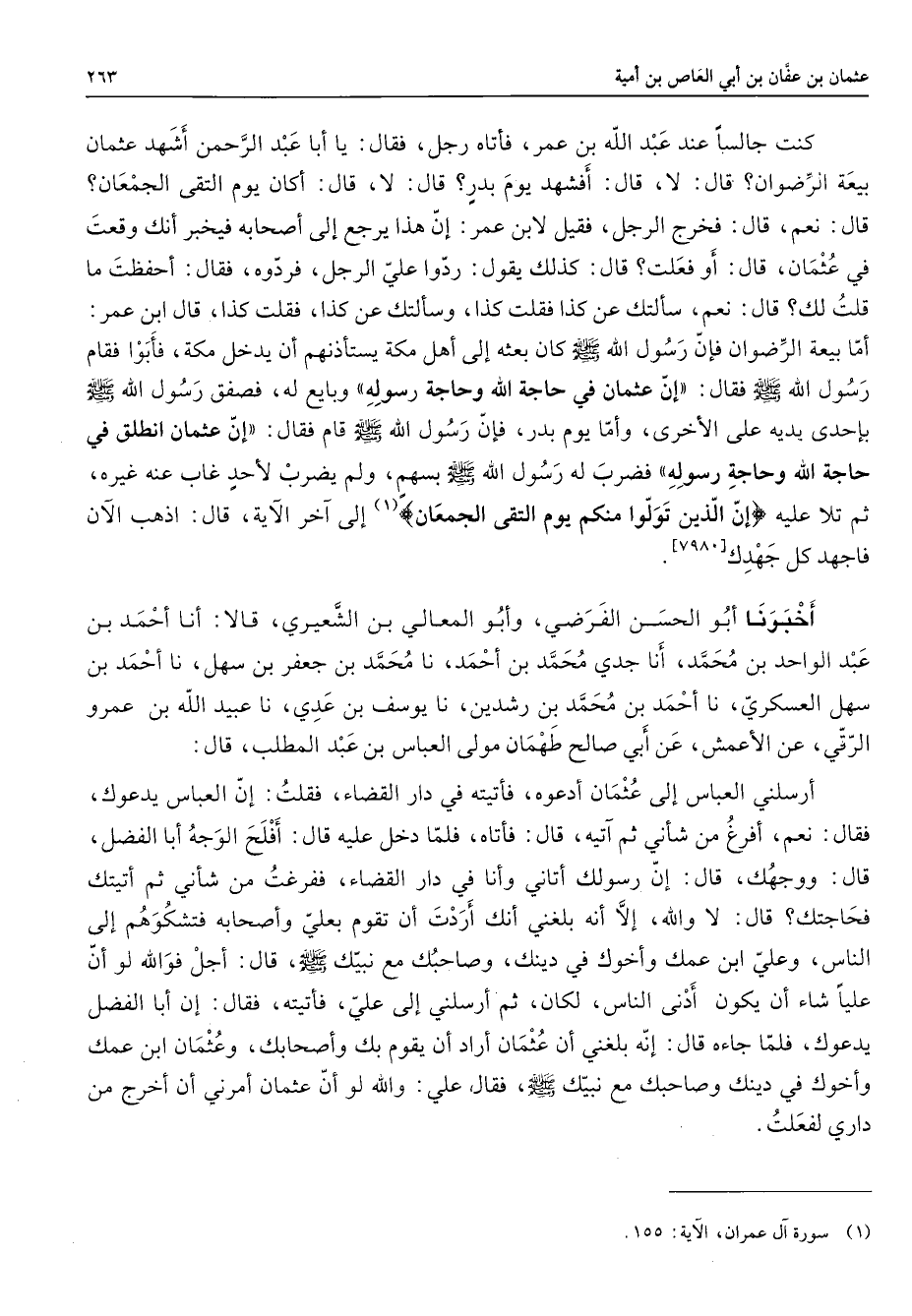 كنت جالسا عند عبد الله بن عمر فأتاه رجل فقال يا أبا عبد الرحمن أشهد عثمان بيعة الرضوان قال لا قال أفشهد يوم بدر قال لا قال أكان يوم التقى الجمعان قال نعم قال فخرج الرجل فقيل لابن عمر إن هذا يرجع إلى أصحابه فيخبر أنك وقعت في عثمان قال أو فعلت قال كذلك يقول ردوا علي الرجل فردوه فقال أحفظت ما قلت لك قال نعم سألتك عن كذا فقلت كذا وسألتك عن كذا فقلت كذا قال ابن عمر أما بيعة الرضوان فإن رسول الله (صلى الله عليه وسلم) كان بعثه إلى أهل مكة يستأذنهم أن يدخل مكة فأبوا فقام رسول الله (صلى الله عليه وسلم) فقال إن عثمان في حاجة الله وحاجة رسوله وبايع له فصفق رسول الله (صلى الله عليه وسلم) بإحدى يديه على الأخرى وأما يوم بدر فإن رسول الله (صلى الله عليه وسلم) قام فقال إن عثمان انطلق في حاجة الله وحاجة رسوله فضرب له رسول الله (صلى الله عليه وسلم) بسهم ولم يضرب لأحد غاب عنه غيره ثم تلا عليه " إن الذين تولوا منكم يوم التقى الجمعان " (1) إلى آخر الآية قال اذهب الآن فاجهد كل جهدك