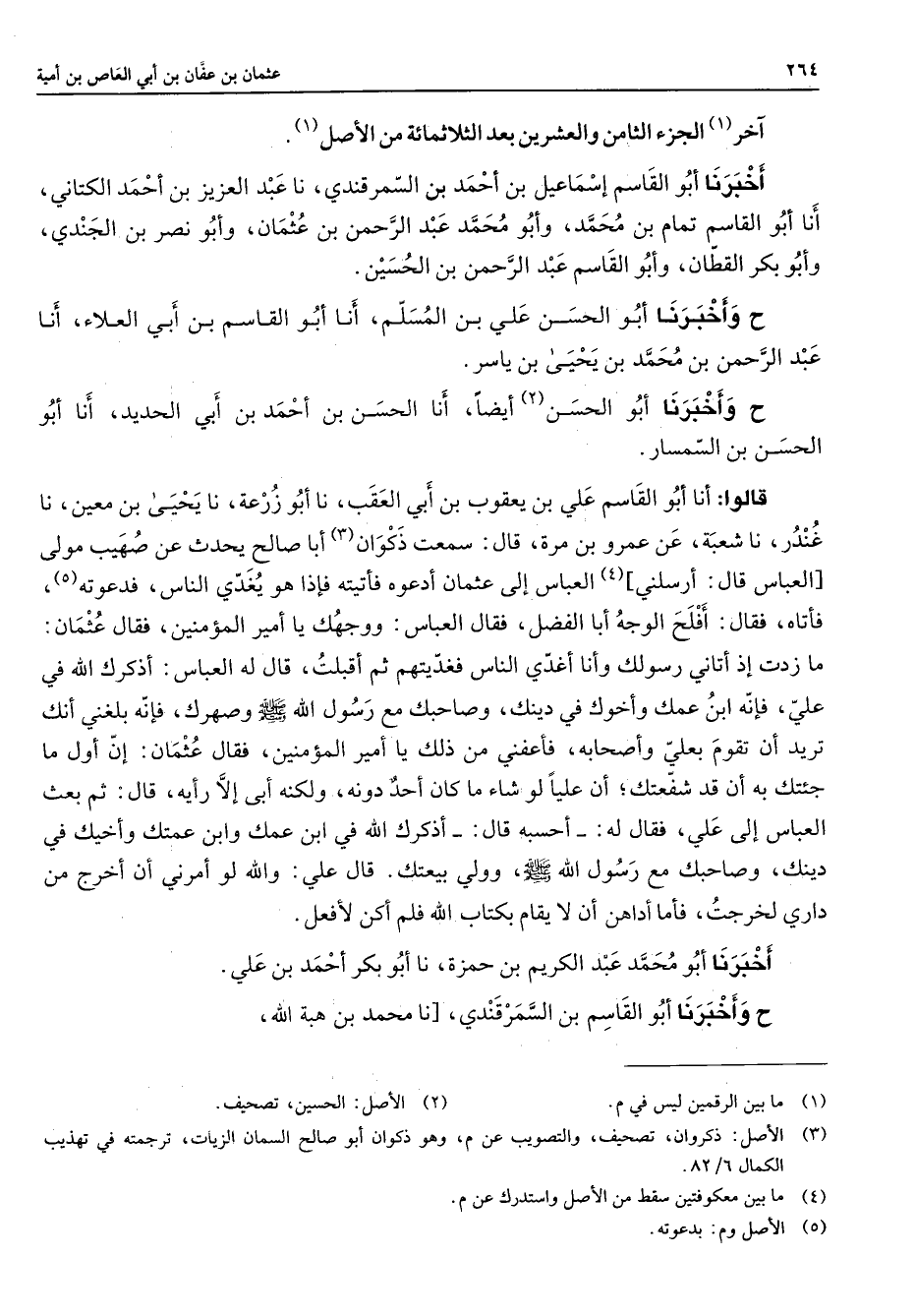 آخر (1) الجزء الثامن والعشرين بعد الثلاثمائة من الأصل (1) أخبرنا أبو القاسم إسماعيل بن أحمد بن السمرقندي نا عبد العزيز بن أحمد الكتاني أنا أبو القاسم تمام بن محمد وأبو محمد عبد الرحمن بن عثمان وأبو نصر بن الجندي وأبو بكر القطان وأبو القاسم عبد الرحمن بن الحسين ح وأخبرنا أبو الحسن (2) علي بن المسلم أنا أبو القاسم بن أبي العلاء أنا عبد الرحمن بن محمد بن يحيى بن ياسر ح وأخبرنا أبو الحسن أيضا أنا الحسن بن أحمد بن أبي الحديد أنا أبو الحسن بن السمسار قالوا أنا أبو القاسم علي بن يعقوب بن أبي العقب نا أبو زرعة نا يحيى بن معين نا غندر نا شعبة عن عمرو بن مرة قال سمعت ذكوان (3) أبا صالح يحدث عن صهيب مولى العباس قال أرسلني (4) العباس إلى عثمان أدعوه فأتيته فإذا هو يغدي الناس فدعوته (5) فأتاه فقال أفلح الوجه أبا الفضل فقال العباس ووجهك يا أمير المؤمنين فقال عثمان ما زدت إذ أتاني رسولك وأنا أغدي الناس فغديتهم ثم أقبلت قال له العباس أذكرك الله في علي فإنه ابن عمك وأخوك في دينك وصاحبك مع رسول الله (صلى الله عليه وسلم) وصهرك فإنه بلغني أنك تريد أن تقوم بعلي وأصحابه فأعفني من ذلك يا أمير المؤمنين فقال عثمان إن أول ما جئتك به أن قد شفعتك أن عليا لو شاء ما كان أحد دونه ولكنه أبى إلا رأيه قال ثم بعث العباس إلى علي فقال له أحسبه قال أذكرك الله في ابن عمك وابن عمتك وأخيك في دينك وصاحبك مع رسول الله (صلى الله عليه وسلم) وولي بيعتك قال علي والله لو أمرني أن أخرج من داري لخرجت فأما أداهن أن لا يقام بكتاب الله فلم أكن لأفعل أخبرنا أبو محمد عبد الكريم بن حمزة نا أبو بكر أحمد بن علي ح وأخبرنا أبو القاسم بن السمرقندي نا محمد بن هبة الله
