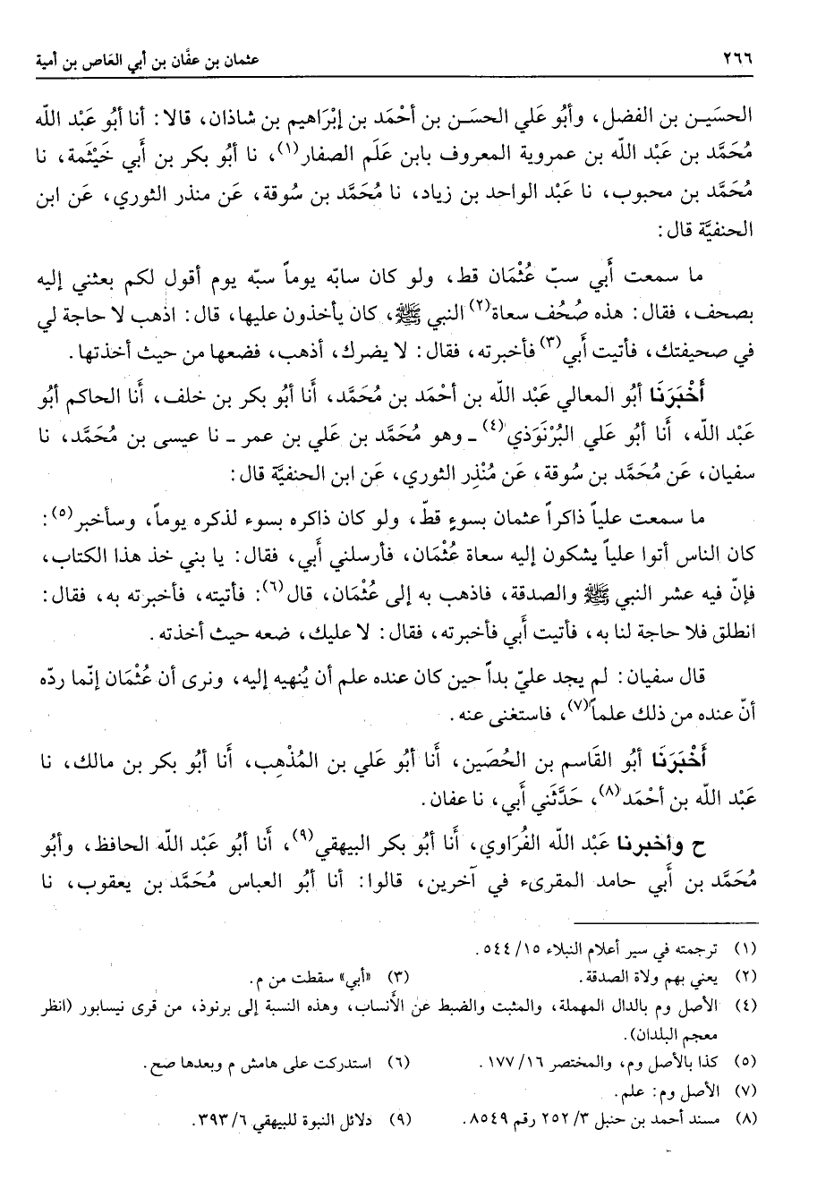 الحسين بن الفضل وأبو علي الحسن بن أحمد بن إبراهيم بن شاذان قالا أنا أبو عبد الله محمد بن عبد الله بن عمروية المعروف بابن علم الصفار (1) أنا أبو بكر بن أبي خيثمة نا محمد بن محبوب نا عبد الواحد بن زياد نا محمد بن سوقة عن منذر الثوري عن ابن الحنفية قال ما سمعت أبي سب عثمان قط ولو كان سابه يوما سبه يوم أقول لكم بعثني إليه بصحف فقال هذه صحف سعاة (2) النبي (صلى الله عليه وسلم) كان يأخذون عليها قال اذهب لا حاجة لي في صحيفتك فأتيت أبي (3) فأخبرته فقال لا يضرك أذهب فضعها من حيث أخذتها أخبرنا أبو المعالي عبد الله بن أحمد بن محمد أنا أبو بكر بن خلف أنا الحاكم أبو عبد الله أنا أبو علي البرنوذي (4) وهو محمد بن علي بن عمر نا عيسى بن محمد نا سفيان عن محمد بن سوقة عن منذر الثوري عن ابن الحنفية قال ما سمعت عليا ذاكرا عثمان بسوء قط ولو كان ذاكره بسوء لذكره يوما وسأخبر (5) كان الناس أتوا عليا يشكون إليه سعاة عثمان فأرسلني أبي فقال يا بني خذ هذا الكتاب فإن فيه عشر النبي (صلى الله عليه وسلم) والصدقة فاذهب به إلى عثمان قال (6) فأتيته فأخبرته به فقال انطلق فلا حاجة لنا به فأتيت أبي فأخبرته فقال لا عليك ضعه حيث أخذته قال سفيان لم يجد علي بدا حين كان عنده علم أن ينهيه إليه ونرى أن عثمان إنما رده أن عنده من ذلك علما (7) فاستغنى عنه أخبرنا أبو القاسم بن الحصين أنا أبو علي بن المذهب أنا أبو بكر بن مالك نا عبد الله بن أحمد (8) حدثني أبي نا عفان ح وأخبرنا عبد الله الفراوي أنا أبو بكر البيهقي (9) أنا أبو عبد الله الحافظ وأبو محمد بن أبي حامد المقرئ في آخرين قالوا أنا أبو العباس محمد بن يعقوب نا
