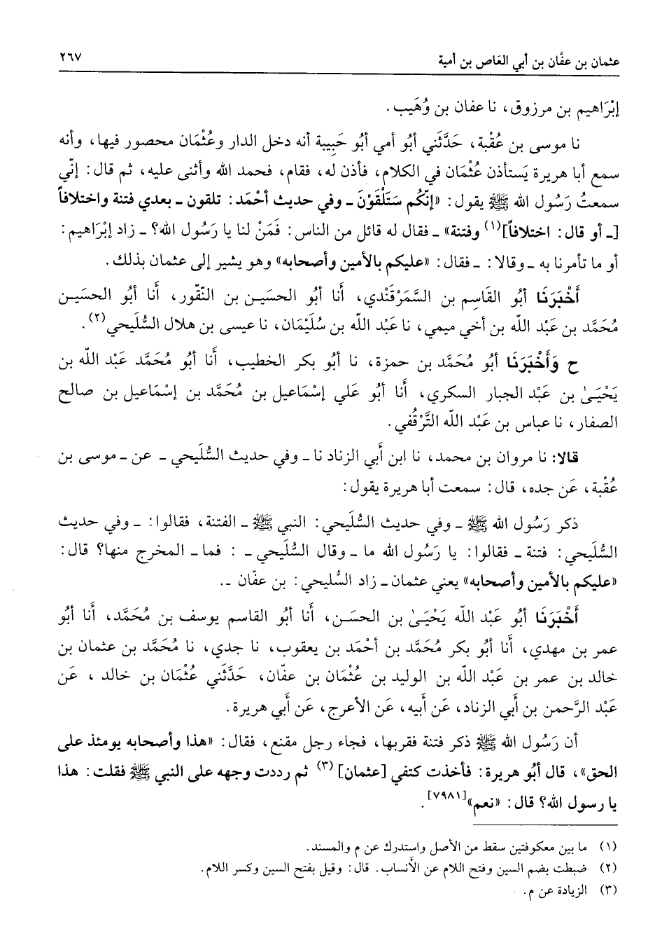 إبراهيم بن مرزوق أنا عفان بن وهيب أنا موسى بن عقبة حدثني أبو أمي أبو حبيبة أنه دخل الدار وعثمان محصور فيها وأنه سمع أبا هريرة يستأذن عثمان في الكلام فأذن له فقام فحمد الله وأثنى عليه ثم قال إني سمعت رسول الله (صلى الله عليه وسلم) يقول إنكم ستلقون وفي حديث أحمد تلقون بعدي فتنة وإختلافا أو قال إختلافا (1) وفتنة فقال له قائل من الناس فمن لنا يا رسول الله زاد إبراهيم أو ما تأمرنا به وقالا فقال عليكم بالأمين وأصحابه وهو يشير إلى عثمان بذلك أخبرنا أبو القاسم بن السمرقندي أنا أبو الحسين بن النقور أنا أبو محمد بن عبد الله بن أخي ميمي أنا عبد الله بن سليمان أنا عيسى بن هلال السليحي (2) ح وأخبرنا أبو محمد بن حمزة أنا أبو بكر الخطيب أنا أبو محمد عبد الله بن يحيى بن عبد الجبار السكري أنا أبو علي إسماعيل بن محمد بن إسماعيل بن صالح الصفار أنا عباس بن عبد الله الترقفي قالا أنا مروان بن محمد أنا ابن أبي الزناد أنا وفي حديث السليحي عن موسى بن عقبة عن جده قال سمعت أبا هريرة يقول ذكر رسول الله (صلى الله عليه وسلم) وفي حديث السليحي النبي (صلى الله عليه وسلم) الفتنة فقالوا وفي حديث السليحي فتنة فقالوا يا رسول الله ما وقال السليحي فما المخرج منها قال عليكم بالأمين وأصحابه يعين عثمان زاد السليحي بن عفان أخبرنا أبو عبد الله يحيى بن الحسن أنا أبو القاسم يوسف بن محمد أنا أبو عمر بن مهدي أنا أبو بكر محمد بن أحمد بن يعقوب أنا جدي أنا محمد بن عثمان بن خالد بن عمر بن عبد الله بن الوليد بن عثمان بن عفان حدثني عثمان بن خالد عن عبد الرحمن بن أبي الزناد عن أبيه عن الأعرج عن أبي هريرة أن رسول الله (صلى الله عليه وسلم) ذكر فتنة فقربها فجاء رجل مقنع فقال هذا وأصحابه يومئذ على الحق قال أبو هريرة فأخذت كتفي عثمان (3) ثم رددت وجهه على النبي (صلى الله عليه وسلم) فقلت هذا يا رسول الله قال نعم