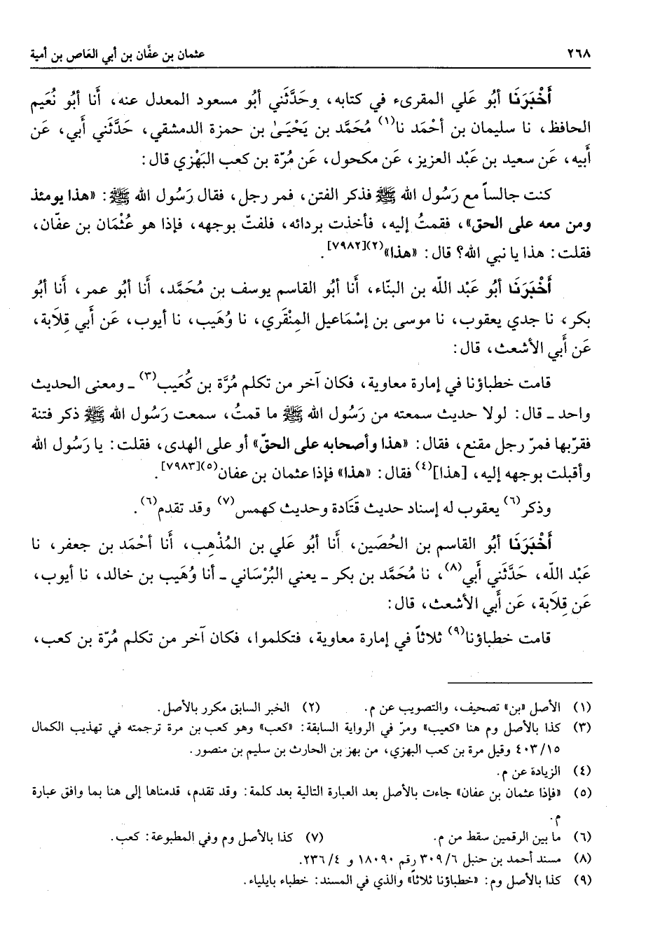 [7982] أخبرنا أبو عبد الله بن البناء أنا أبو القاسم يوسف بن محمد أنا أبو عمر أنا أبو بكر نا جدي يعقوب نا موسى بن إسماعيل المنقري نا وهيب نا أيوب عن أبي قلابة عن أبي الأشعث قال قامت خطباؤنا في إمارة معاوية فكان آخر من تكلم مرة بن كعيب (3) ومعنى الحديث واحد قال لولا حديث سمعته من رسول الله (صلى الله عليه وسلم) ما قمت سمعت رسول الله (صلى الله عليه وسلم) ذكر فتنة فقربها فمر رجل مقنع فقال هذا وأصحابه على الحق أو على الهدى فقلت يا رسول الله وأقبلت بوجهه إليه هذا فقال هذا (4) فإذا عثمان بن عفان (5)