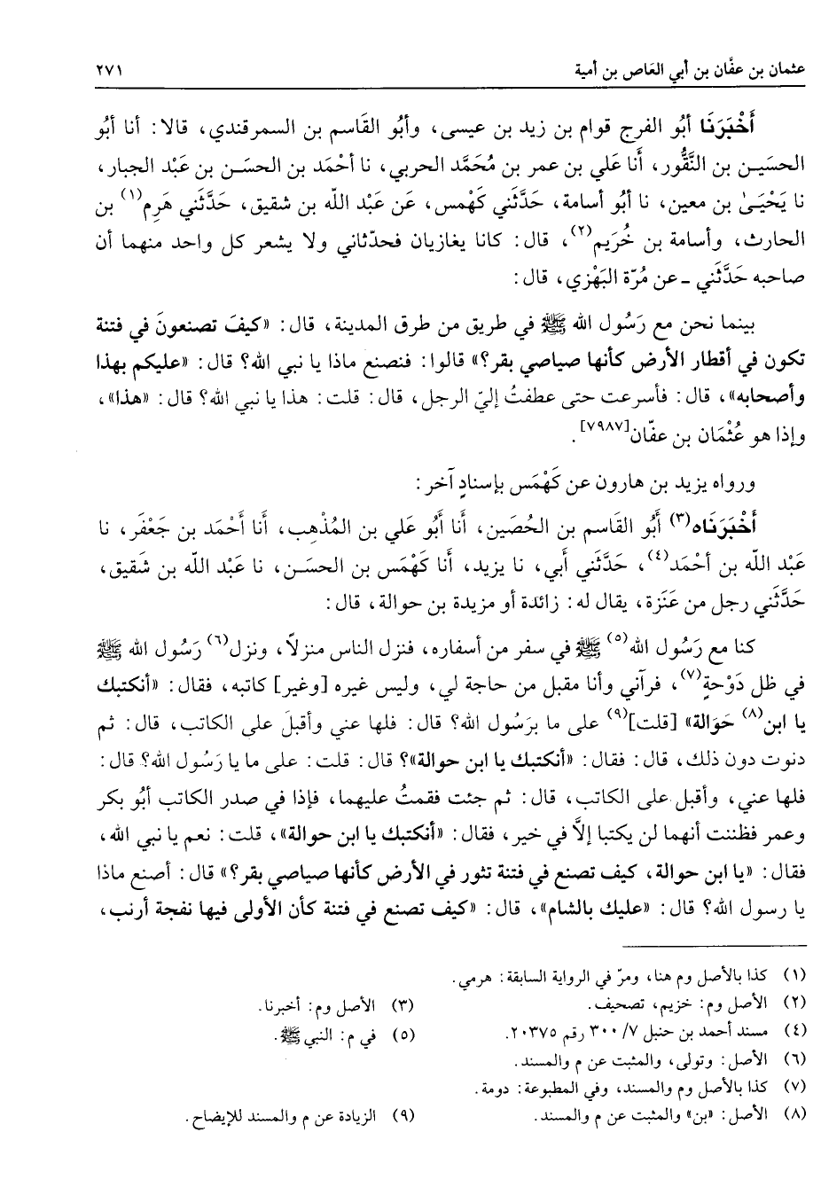 [7987] ورواه يزيد بن هارون عن كهمس بإسناد آخر أخبرناه (3) أبو القاسم بن الحصين أنا أبو علي بن المذهب أنا أحمد بن جعفر نا عبد الله بن أحمد (4) حدثني أبي نا يزيد أنا كهمس بن الحسن نا عبد الله بن شقيق حدثني رجل من عنزة يقال له زائدة أو مزيدة بن حوالة قال كنا مع رسول الله (5) (صلى الله عليه وسلم) في سفر من أسفاره فنزل الناس منزلا ونزل (6) رسول الله (صلى الله عليه وسلم) في ظل دوحة (7) فرآني وأنا مقبل من حاجة لي وليس غيره وغير كاتبه فقال أنكتبك يا ابن (8) حوالة قلت (9) على ما برسول الله قال فلها عني وأقبل على الكاتب قال ثم دنوت دون ذلك قال فقال أنكتبك يا ابن حوالة قال قلت على ما يا رسول الله قال فلها عني وأقبل على الكاتب قال ثم جئت فقمت عليهما فإذا في صدر الكاتب أبو بكر وعمر فظننت أنهما لن يكتبا إلا في خير فقال أنكتبك يا ابن حوالة قلت نعم يا نبي الله فقال يا ابن حوالة كيف تصنع في فتنة تثور في الأرض كأنها صياصي بقر قال أصنع ماذا يا رسول الله قال عليك بالشام قال كيف تصنع في فتنة كأن الأولى فيها نفجة أرنب