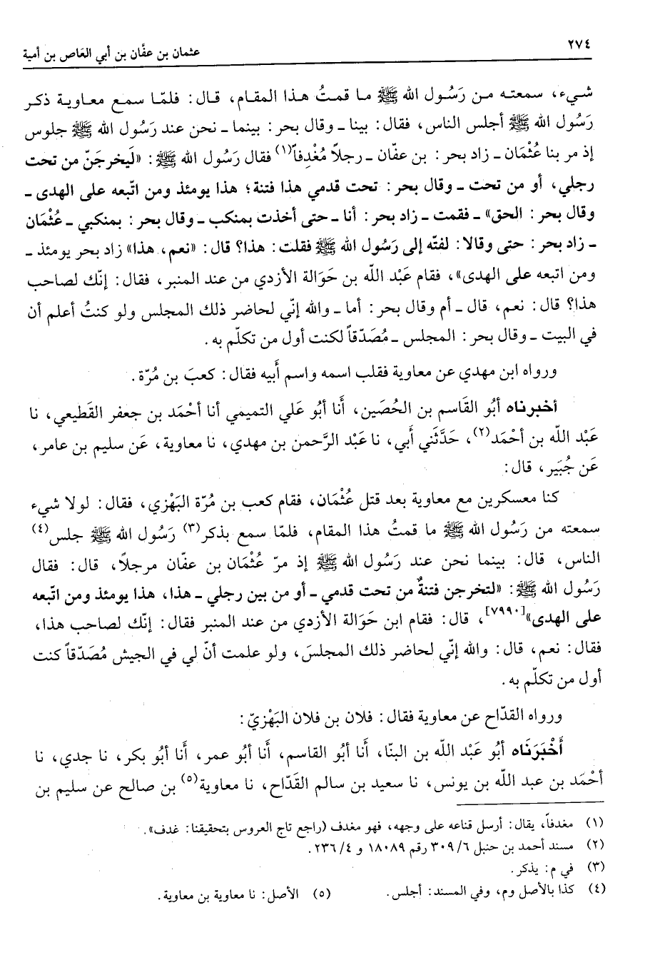 شئ سمعته من رسول الله (صلى الله عليه وسلم) ما قمت هذا المقام قال فلما سمع معاوية ذكر رسول الله (صلى الله عليه وسلم) أجلس الناس فقال بينا وقال بحر بينما نحن عند رسول الله (صلى الله عليه وسلم) جلوس إذ مر بنا عثمان زاد بحر بن عفان رجلا مغدفا (1) فقال رسول الله (صلى الله عليه وسلم) ليخرجن من تحت رجلي أو من تحت وقال بحر تحت قدمي هذا فتنة هذا يومئذ ومن اتبعه على الهدى وقال بحر الحق فقمت زاد بحر أنا حتى أخذت بمنكب وقال بحر بمنكبي عثمان زاد بحر حتى وقالا لفته إلى رسول الله (صلى الله عليه وسلم) فقلت هذا قال نعم هذا زاد بحر يومئذ ومن اتبعه على الهدى فقام عبد الله بن حوالة الأزدي من عند المنبر فقال إنك لصاحب هذا قال نعم قال أم وقال بحر أما والله إني لحاضر ذلك المجلس ولو كنت أعلم أن في البيت وقال بحر المجلس مصدقا لكنت أول من تكلم به ورواه ابن مهدي عن معاوية فقلب اسمه واسم أبيه فقال كعب بن مرة أخبرناه أبو القاسم بن الحصين أنا أبو علي التميمي أنا أحمد بن جعفر القطيعي نا عبد الله بن أحمد (2) حدثني أبي نا عبد الرحمن بن مهدي نا معاوية عن سليم بن عامر عن جبير قال كنا معسكرين مع معاوية بعد قتل عثمان فقام كعب بن مرة البهزي فقال لولا شئ سمعته من رسول الله (صلى الله عليه وسلم) ما قمت هذا المقام فلما سمع بذكر (3) رسول الله (صلى الله عليه وسلم) جلس (4) الناس قال بينما نحن عند رسول الله (صلى الله عليه وسلم) إذ مر عثمان بن عفان مرجلا قال فقال رسول الله (صلى الله عليه وسلم) لتخرجن فتنة من تحت قدمي أو من بين رجلي هذا هذا يومئذ ومن اتبعه على الهدى