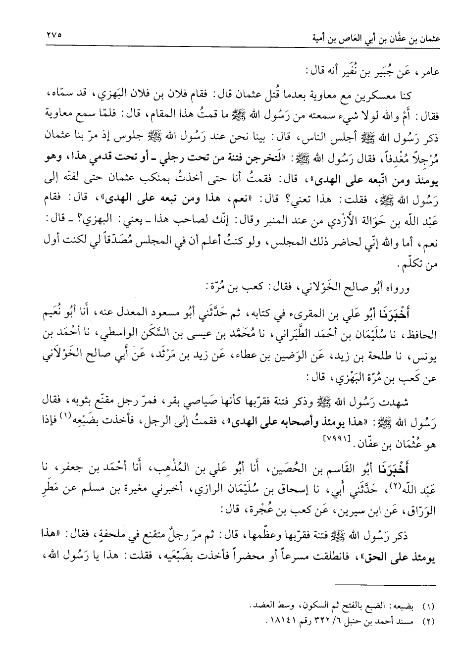 عامر عن جبير بن نفير أنه قال كنا معسكرين مع معاوية بعدما قتل عثمان قال فقام فلان بن فلان البهزي قد سماه فقال أم والله لولا شئ سمعته من رسول الله (صلى الله عليه وسلم) ما قمت هذا المقام قال فلما سمع معاوية ذكر رسول الله (صلى الله عليه وسلم) أجلس الناس قال بينا نحن عند رسول الله (صلى الله عليه وسلم) جلوس إذ مر بنا عثمان مرجلا مغدفا فقال رسول الله (صلى الله عليه وسلم) لتخرجن فتنة من تحت رجلي أو تحت قدمي هذا وهو يومئذ ومن اتبعه على الهدى قال فقمت أنا حتى أخذت بمنكب عثمان حتى لفته إلى رسول الله (صلى الله عليه وسلم) فقلت هذا تعني قال نعم هذا ومن تبعه على الهدى قال فقام عبد الله بن حوالة الأزدي من عند المنبر وقال إنك لصاحب هذا يعني البهزي قال نعم أما والله إني لحاضر ذلك المجلس ولو كنت أعلم أن في المجلس مصدقا لي لكنت أول من تكلم ورواه أبو صالح الخولاني فقال كعب بن مرة أخبرنا أبو علي بن المقرئ في كتابه ثم حدثني أبو مسعود المعدل عنه أنا أبو نعيم الحافظ نا سليمان بن أحمد الطبراني نا محمد بن عيسى بن السكن الواسطي نا أحمد بن يونس نا طلحة بن زيد عن الوضين بن عطاء عن زيد بن مرثد عن أبي صالح الخولاني عن كعب بن مرة البهزي قال شهدت رسول الله (صلى الله عليه وسلم) وذكر فتنة فقربها كأنها صياصي بقر فمر رجل مقنع بثوبه فقال رسول الله (صلى الله عليه وسلم) هذا يومئذ وأصحابه على الهدى فقمت إلى الرجل فأخذت بضبعه (1) فإذا هو عثمان بن عفان