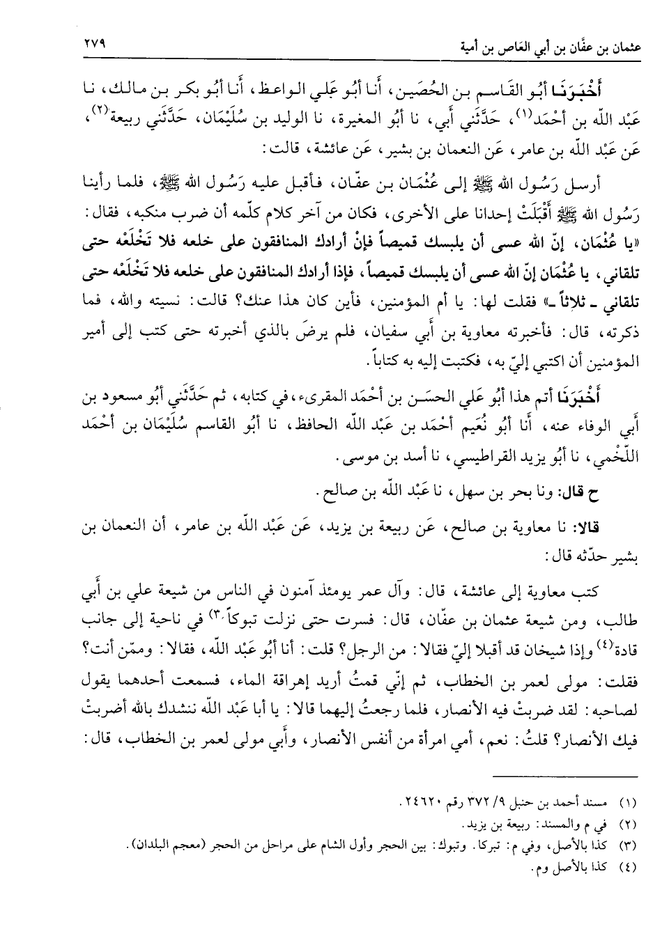 أخبرنا أبو القاسم بن الحصين أنا أبو علي الواعظ أنا أبو بكر بن مالك نا عبد الله بن أحمد (1) حدثني أبي نا أبو المغيرة نا الوليد بن سليمان حدثني ربيعة (2) عن عبد الله بن عامر عن النعمان بن بشير عن عائشة قالت أرسل رسول الله (صلى الله عليه وسلم) إلى عثمان بن عفان فأقبل عليه رسول الله (صلى الله عليه وسلم) فلما رأينا رسول الله (صلى الله عليه وسلم) أقبلت إحدانا على الأخرى فكان من آخر كلام كلمه أن ضرب منكبه فقال يا عثمان إن الله عسى أن يلبسك قميصا فإن أرادك المنافقون على خلعه فلا تخلعه حتى تلقاني يا عثمان إن الله عسى أن يلبسك قميصا فإذا أرادك المنافقون على خلعه فلا تخلعه حتى تلقاني ثلاثا فقلت لها يا أم المؤمنين فأين كان هذا عنك قالت نسيته والله فما ذكرته قال فأخبرته معاوية بن أبي سفيان فلم يرض بالذي أخبرته حتى كتب إلى أمير المؤمنين أن اكتبي إلي به فكتبت إليه به كتابا أخبرنا أتم هذا أبو علي الحسن بن أحمد المقرئ في كتابه ثم حدثني أبو مسعود بن أبي الوفاء عنه أنا أبو نعيم أحمد بن عبد الله الحافظ نا أبو القاسم سليمان بن أحمد اللخمي نا أبو يزيد القراطيسي نا أسد بن موسى ح قال ونا بحر بن سهل نا عبد الله بن صالح قالا نا معاوية بن صالح عن ربيعة بن يزيد عن عبد الله بن عامر أن النعمان بن بشير حدثه قال كتب معاوية إلى عائشة قال وآل عمر يومئذ آمنون في الناس من شيعة علي بن أبي طالب ومن شيعة عثمان بن عفان قال فسرت حتى نزلت تبوكا (3) في ناحية إلى جانب قادة (4) وإذا شيخان قد أقبلا إلي فقالا من الرجل قلت أنا أبو عبد الله فقالا وممن أنت فقلت مولى لعمر بن الخطاب ثم إني قمت أريد إهراقة الماء فسمعت أحدهما يقول لصاحبه لقد ضربت فيه الأنصار فلما رجعت إليهما قالا يا أبا عبد الله ننشدك بالله أضربت فيك الأنصار قلت نعم أمي امرأة من أنفس الأنصار وأبي مولى لعمر بن الخطاب قال