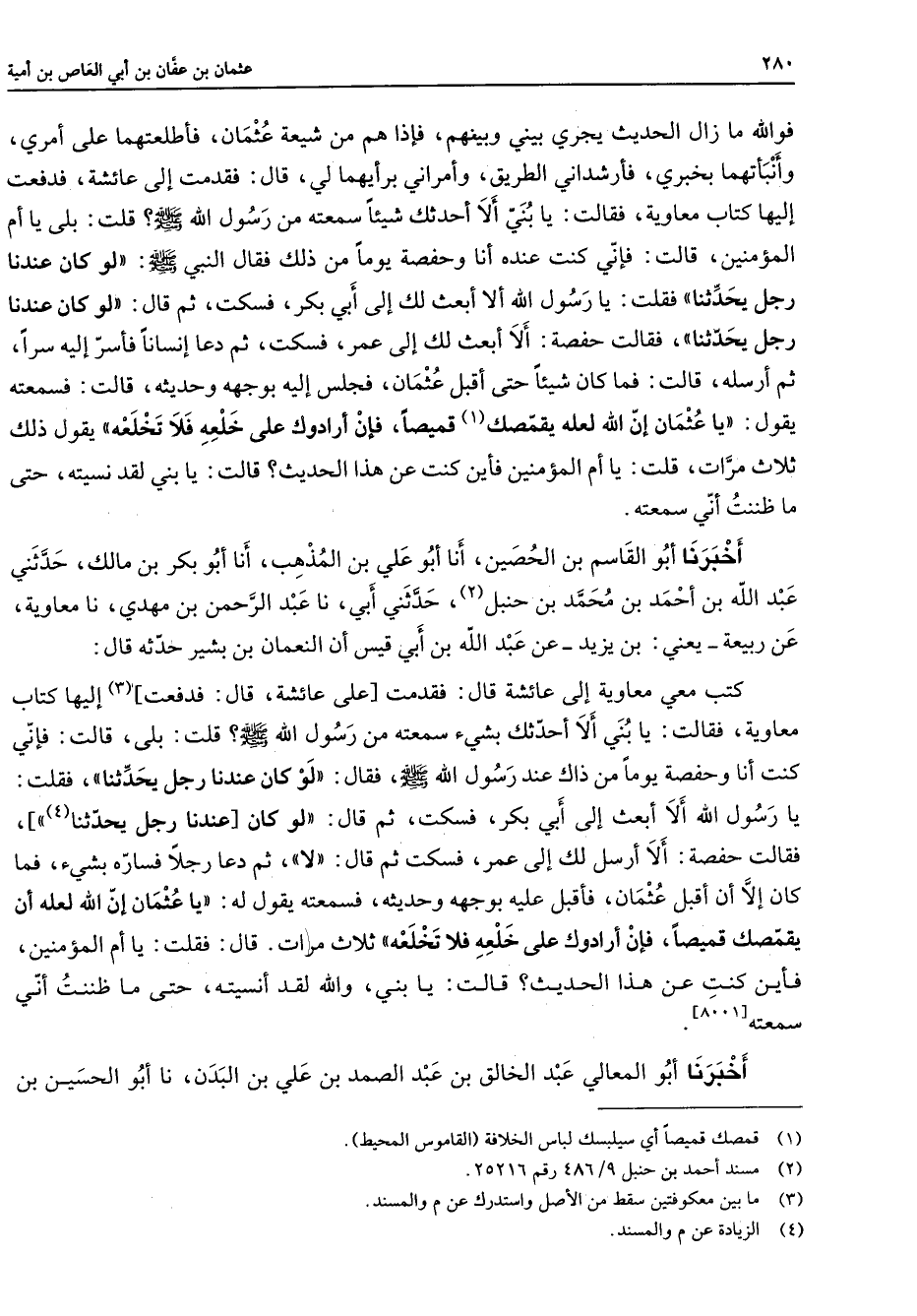 فوالله ما زال الحديث يجري بيني وبينهم فإذا هم من شيعة عثمان فأطلعتهما على أمري وأنبأتهما بخبري فأرشداني الطريق وأمراني برأيهما لي قال فقدمت إلى عائشة فدفعت إليها كتاب معاوية فقالت يا بني ألا أحدثك شيئا سمعته من رسول الله (صلى الله عليه وسلم) قلت بلى يا أم المؤمنين قالت فإني كنت عنده أنا وحفصة يوما من ذلك فقال النبي (صلى الله عليه وسلم) لو كان عندنا رجل يحدثنا فقلت يا رسول الله ألا أبعث لك إلى أبي بكر فسكت ثم قال لو كان عندنا رجل يحدثنا فقالت حفصة ألا أبعث لك إلى عمر فسكت ثم دعا إنسانا فأسر إليه سرا ثم أرسله قال فما كان شيئا حتى أقبل عثمان فجلس إليه بوجهه وحديثه قالت فسمعته يقول يا عثمان إن الله لعله يقمصك (1) قميصا فإن أرادوك على خلعه فلا تخلعه يقول ذلك ثلاث مرات قلت يا أم المؤمنين فأين كنت عن هذا الحديث قالت يا بني لقد نسيته حتى ما ظننت أني سمعته أخبرنا أبو القاسم بن الحصين أنا أبو علي بن المذهب أنا أبو بكر بن مالك حدثني عبد الله بن أحمد بن محمد بن حنبل (2) حدثني أبي نا عبد الرحمن بن مهدي نا معاوية عن ربيعة يعني بن يزيد عن عبد الله بن أبي قيس أن النعمان بن بشير حدثه قال كتب معي معاوية إلى عائشة قال فقدمت على عائشة قال فدفعت (3) إليها كتاب معاوية فقالت يا بني ألا أحدثك بشئ سمعته من رسول الله (صلى الله عليه وسلم) قلت بلى قالت فإني كنت أنا وحفصة يوما من ذاك عند رسول الله (صلى الله عليه وسلم) فقال لو كان عندنا رجل يحدثنا فقلت يا رسول الله ألا أبعث إلى أبي بكر فسكت ثم قال لو كان عندنا رجل يحدثنا (4) فقالت حفصة ألا أرسل لك إلى عمر فسكت ثم قال لا ثم دعا رجلا فساره بشئ فما كان إلا أن أقبل عثمان فأقبل عليه بوجهه وحديثه فسمعته يقول له يا عثمان إن الله لعله أن يقمصك قميصا فإن أرادوك على خلعه فلا تخلعه ثلاث مرات قال فقلت يا أم المؤمنين فأين كنت عن هذا الحديث قالت يا بني والله لقد أنسيته حتى ما ظننت أني سمعته