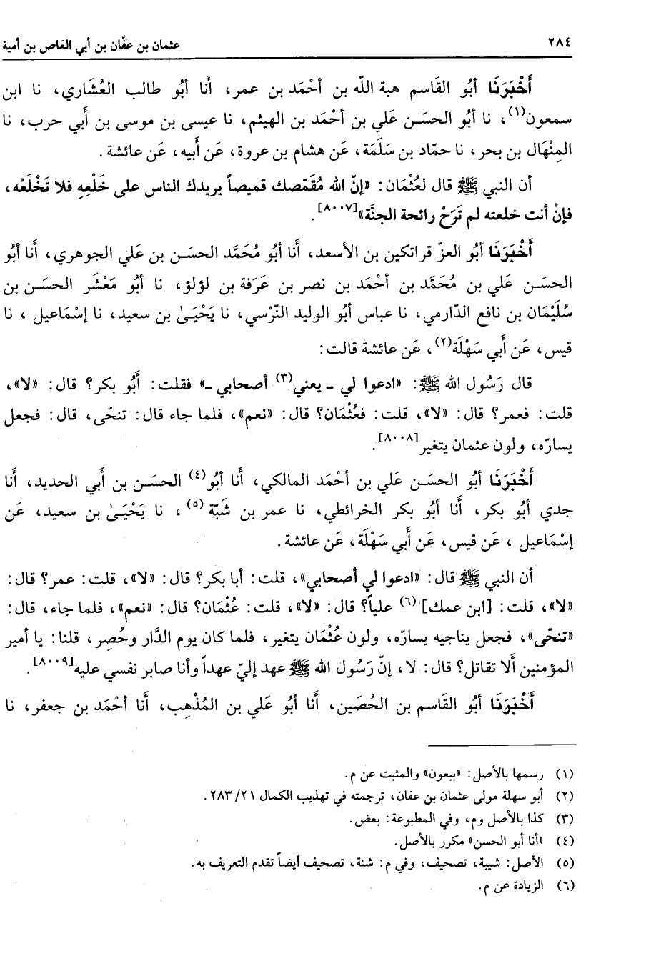 [8008] أخبرنا أبو الحسن علي بن أحمد المالكي أنا أبو (4) الحسن بن أبي الحديد أنا جدي أبو بكر أنا أبو بكر الخرائطي نا عمر بن شبة (5) نا يحيى بن سعيد عن إسماعيل عن قيس عن أبي سهلة عن عائشة أن النبي (صلى الله عليه وسلم) قال ادعوا لي أصحابي قلت أبا بكر قال لا قلت عمر قال لا قلت ابن عمك (6) عليا قال لا قلت عثمان قال نعم فلما جاء قال تنحى فجعل يناجيه يساره ولون عثمان يتغير فلما كان يوم الدار وحصر قلنا يا أمير المؤمنين ألا تقاتل قال لا إن رسول الله (صلى الله عليه وسلم) عهد إلي عهدا وأنا صابر نفسي عليه