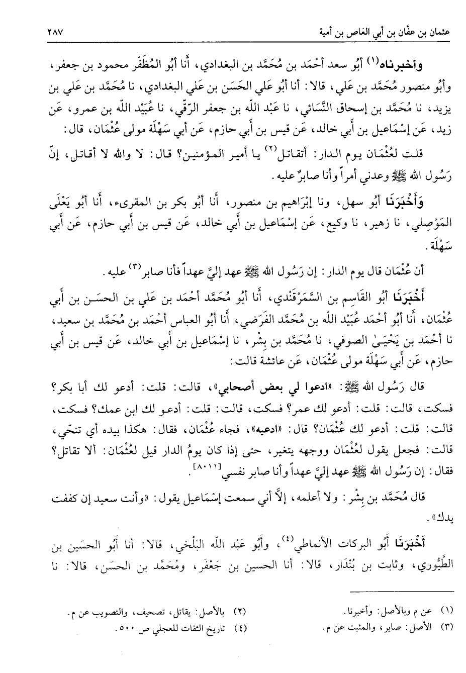 وأخبرناه (1) أبو سعد أحمد بن محمد بن البغدادي أنا أبو المظفر محمود بن جعفر وأبو منصور محمد بن علي قالا أنا أبو علي الحسن بن علي البغدادي نا محمد بن علي بن يزيد نا محمد بن إسحاق النسائي نا عبد الله بن جعفر الرقي نا عبيد الله بن عمرو عن زيد عن إسماعيل بن أبي خالد عن قيس بن أبي حازم عن أبي سهلة مولى عثمان قال قلت لعثمان يوم الدار أتقاتل (2) يا أمير المؤمنين قال لا والله لا أقاتل إن رسول الله (صلى الله عليه وسلم) وعدني أمرا وأنا صابر عليه وأخبرنا أبو سهل ونا إبراهيم بن منصور أنا أبو بكر بن المقرئ أنا أبو يعلى الموصلي نا زهير نا وكيع عن إسماعيل بن أبي خالد عن قيس بن أبي حازم عن أبي سهلة أن عثمان قال يوم الدار إن رسول الله (صلى الله عليه وسلم) عهد إلي عهدا فأنا صابر (3) عليه أخبرنا أبو القاسم بن السمرقندي أنا أبو محمد أحمد بن علي بن الحسن بن أبي عثمان أنا أبو أحمد عبيد الله بن محمد الفرضي أنا أبو العباس أحمد بن محمد بن سعيد نا أحمد بن يحيى الصوفي نا محمد بن بشر نا إسماعيل بن أبي خالد عن قيس بن أبي حازم عن أبي سهلة مولى عثمان عن عائشة قالت قال رسول الله (صلى الله عليه وسلم) ادعوا لي بعض أصحابي قالت قلت أدعو لك أبا بكر فسكت قالت قلت أدعو لك عمر فسكت قالت قلت أدعو لك ابن عمك فسكت قالت قلت أدعو لك عثمان قال ادعيه فجاء عثمان فقال هكذا بيده أي تنحي قالت فجعل يقول لعثمان ووجهه يتغير حتى إذا كان يوم الدار قيل لعثمان ألا تقاتل فقال إن رسول الله (صلى الله عليه وسلم) عهد إلي عهدا وأنا صابر نفسي