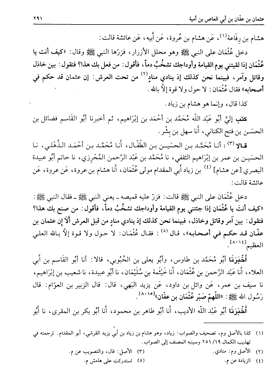 هشام بن رفاعة (1) عن هشام بن عروة عن أبيه عن عائشة قالت دخل عثمان على النبي (صلى الله عليه وسلم) وهو محلل الأزرار فزرها النبي (صلى الله عليه وسلم) وقال كيف أنت يا عثمان إذا لقيتني يوم القيامة وأوداجك تشخب دما فأقول من فعل بك هذا فتقول بين خاذل وقاتل وآمر فبينما نحن كذلك إذ ينادي مناد (2) من تحت العرش إن عثمان قد حكم في أصحابه فقال عثمان لا حول ولا قوة إلا بالله كذا قال وإنما هو هشام بن زياد كتب إلي أبو عبد الله محمد بن أحمد بن إبراهيم ثم أخبرنا أبو القاسم فضائل بن الحسن بن فتح الكناني أنا سهل بن بشر قالا (3) أنا محمد بن الحسين بن الطفال أنا محمد بن أحمد الذهلي نا الحسين بن عمر بن إبراهيم الثقفي نا محمد بن عبد الرحمن المحرزي نا حاتم أبو عبيدة البصري عن هشام (4) بن زياد أبي المقدام مولى عثمان أنا هشام بن عروة عن عروة عن عائشة قالت دخل عثمان على النبي (صلى الله عليه وسلم) قالت فزر عليه قميصه يعني النبي (صلى الله عليه وسلم) فقال النبي (صلى الله عليه وسلم) كيف أنت يا عثمان إذا جئتني يوم القيامة وأوداجك تشخب دما فأقول من صنع بك هذا فتقول بين آمر وقاتل وخاذل فبينما نحن كذلك إذ ينادي مناد من قبل العرش ألا إن عثمان بن عفان قد حكم في أصحابه قال (5) فقال عثمان لا حول ولا قوة إلا بالله العلي العظيم