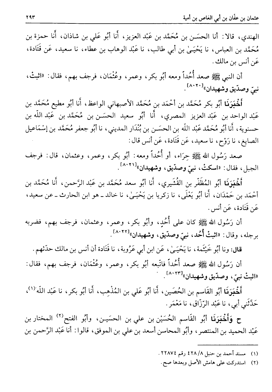 الهندي قالا أنا الحسن بن محمد بن عبد العزيز أنا أبو علي بن شاذان أنا حمزة بن محمد بن العباس نا يحيى بن أبي طالب نا عبد الوهاب بن عطاء نا سعيد عن قتادة عن أنس بن مالك أن النبي (صلى الله عليه وسلم) صعد أحدا ومعه أبو بكر وعمر وعثمان فرجف بهم فقال اثبت نبي وصديق وشهيدان